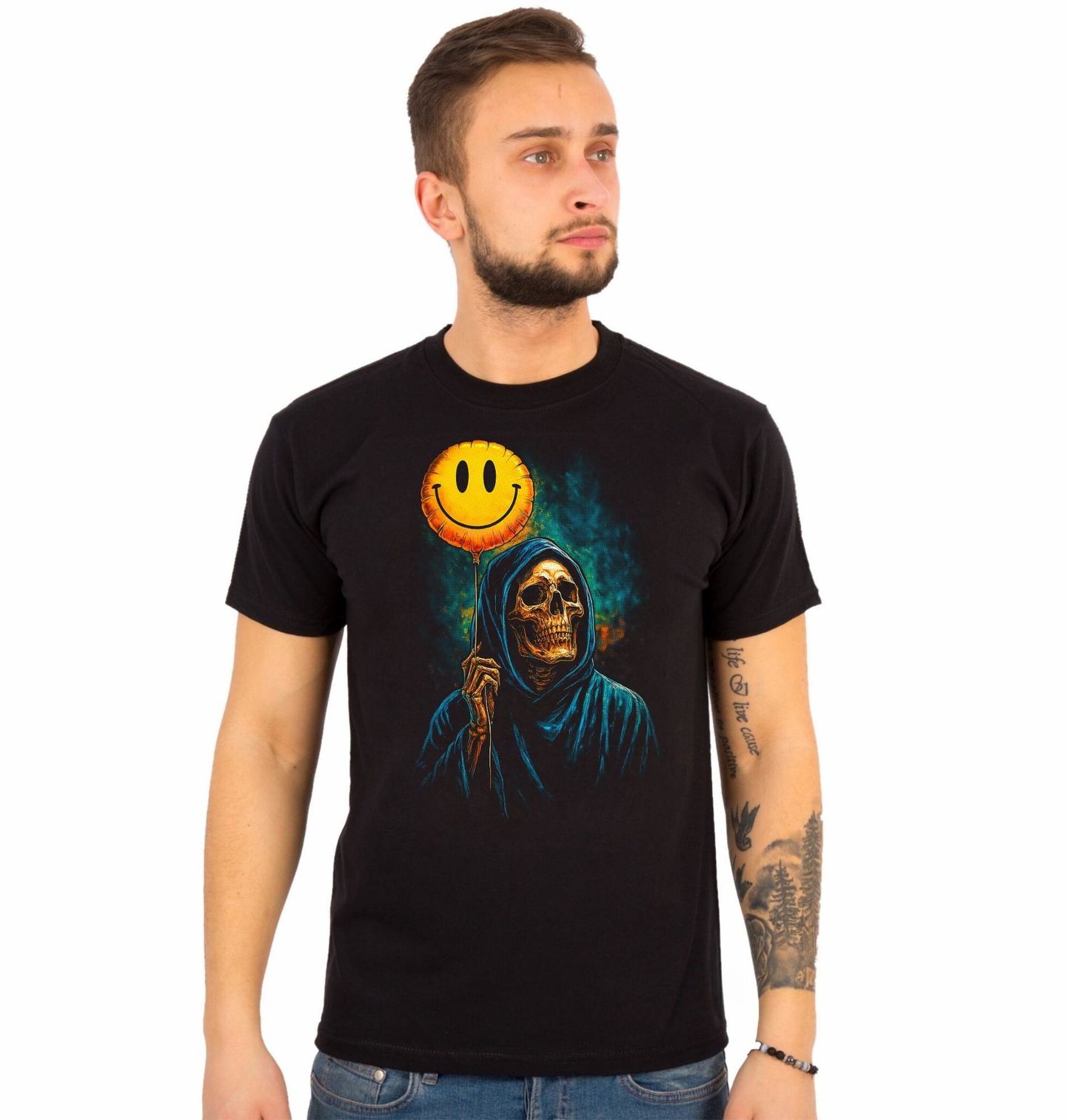 Pánské tričko Kostlivec s Balónkem Úsměv Smrti. Ironie, humor a temnota v jednom – tento originální motiv zachycuje kostlivec v kápi, který drží veselý smajlík jako kontrast k vlastní podstatě. Kombinace lebka a ikonického emoji vytváří silný vizuální efekt, který spojuje černý humor s moderní kulturou. Design pracuje s myšlenkou, že i kostlivec může „nosit úsměv“, a přináší tak jedinečný pohled na život, smrt a emoce.