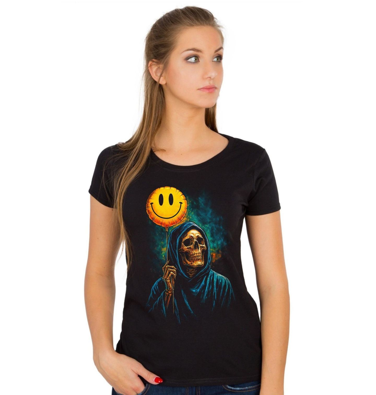 Dámské tričko Kostlivec s Balónkem Úsměv Smrti. Ironie, humor a temnota v jednom – tento originální motiv zachycuje kostlivec v kápi, který drží veselý smajlík jako kontrast k vlastní podstatě. Kombinace lebka a ikonického emoji vytváří silný vizuální efekt, který spojuje černý humor s moderní kulturou. Design pracuje s myšlenkou, že i kostlivec může „nosit úsměv“, a přináší tak jedinečný pohled na život, smrt a emoce.