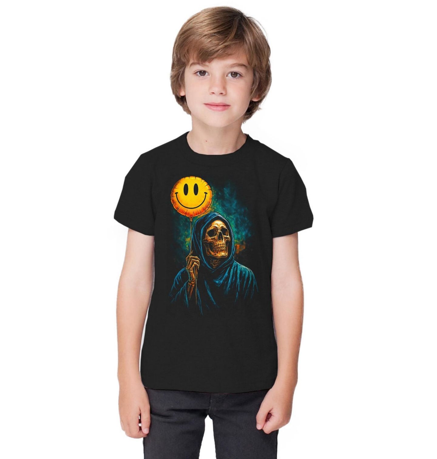 Dětské tričko Kostlivec s Balónkem Úsměv Smrti. Ironie, humor a temnota v jednom – tento originální motiv zachycuje kostlivec v kápi, který drží veselý smajlík jako kontrast k vlastní podstatě. Kombinace lebka a ikonického emoji vytváří silný vizuální efekt, který spojuje černý humor s moderní kulturou. Design pracuje s myšlenkou, že i kostlivec může „nosit úsměv“, a přináší tak jedinečný pohled na život, smrt a emoce.