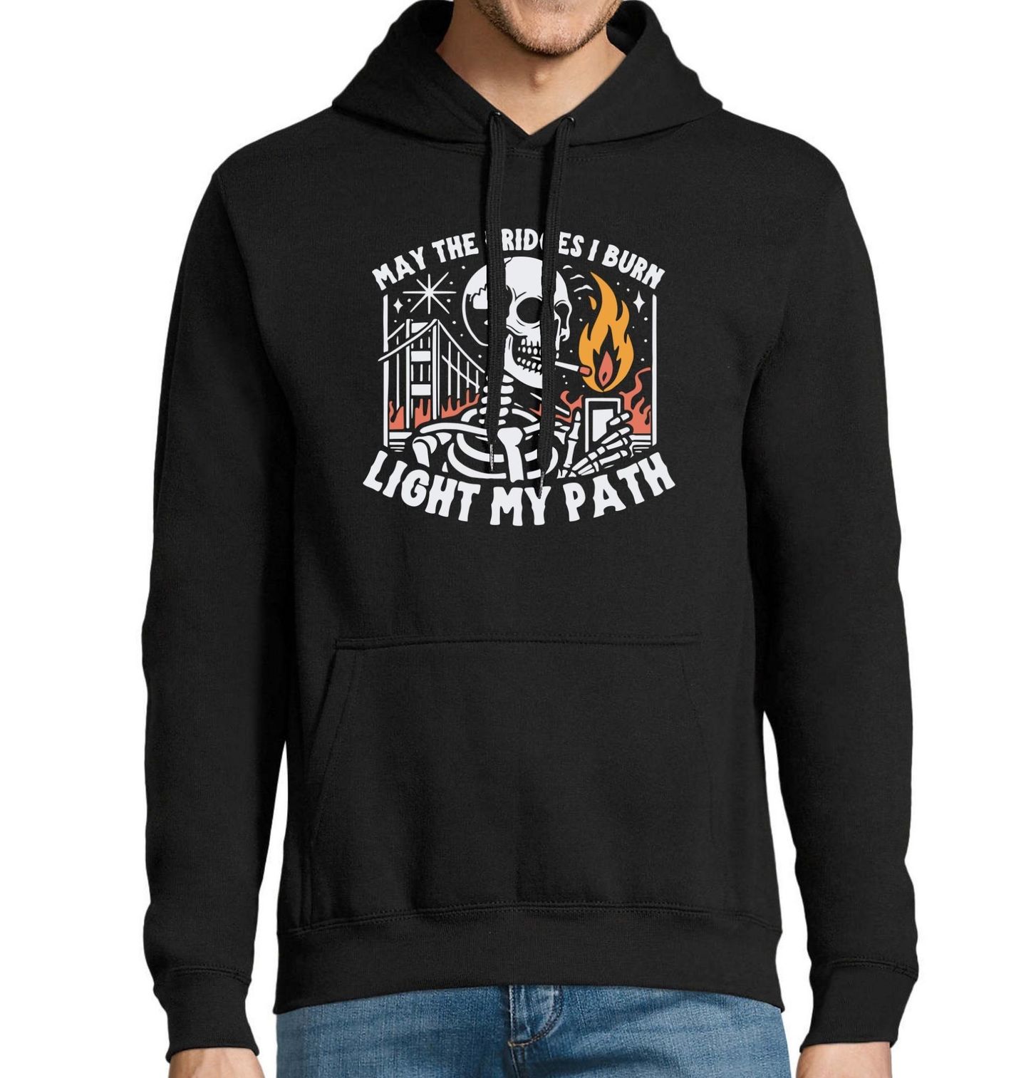 Pánská mikina Kostlivec s cigaretou Nechť mosty, které spálím osvítí mou cestu. "May the bridges I burn light my path" – tento design dokonale vystihuje přístup "žádná cesta zpět". Lebka s cigaretou v ruce a plameny spalující mosty za ní symbolizují nekompromisní postoj a odvahu jít dál bez lítosti. Ideální pro rebely, kteří se nebojí uzavřít staré kapitoly a vydat se vpřed.