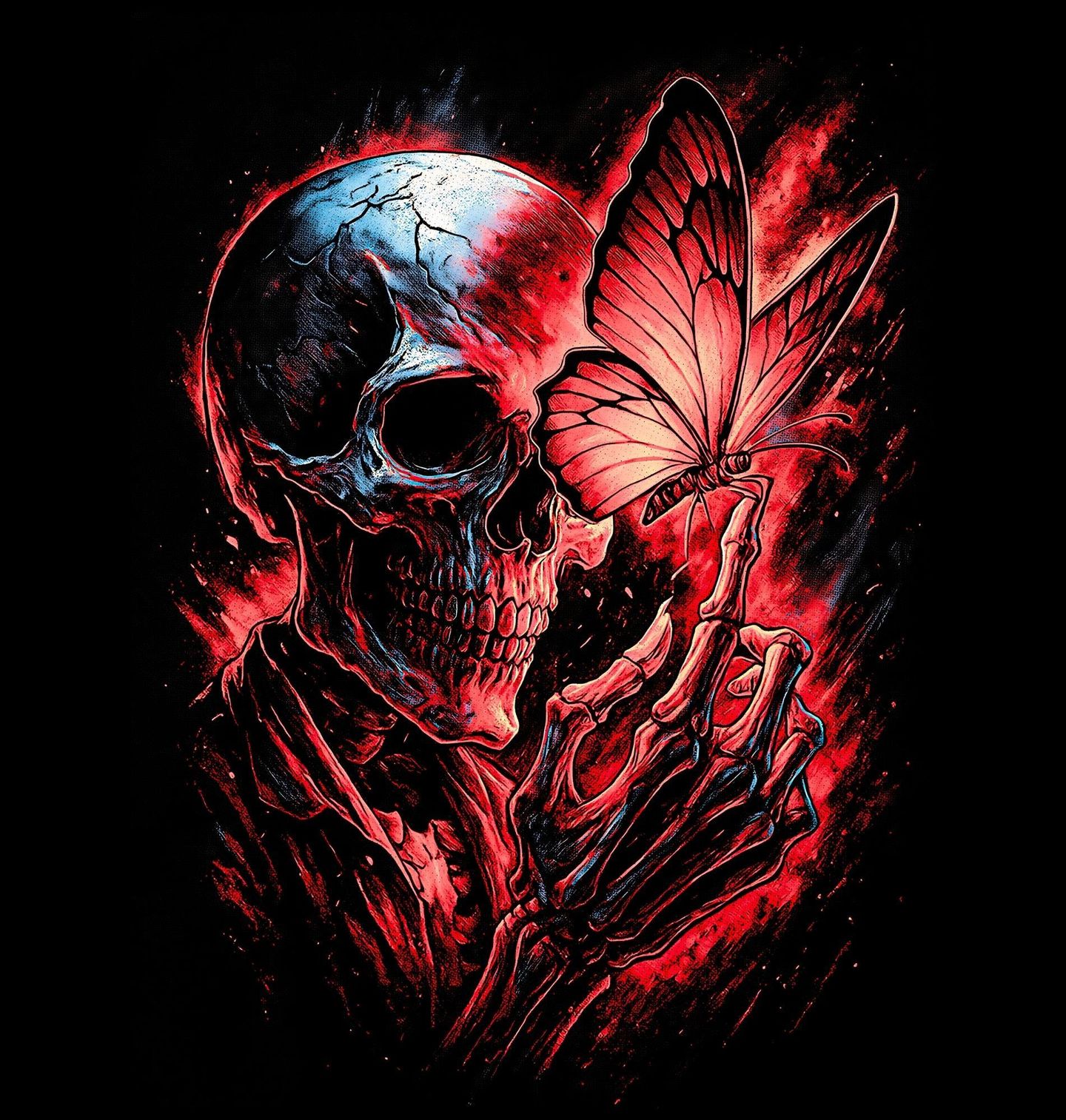 Dámské tričko Kostlivec s Motýlem. Silný a zároveň poetický motiv, který spojuje protiklady života a smrti. Na ilustraci vystupuje kostlivec, jenž jemně drží křehkého motýla – symbol proměny, naděje a pomíjivosti. Kontrast mezi temnou postavou a lehkostí motýla vytváří hluboký vizuální i emocionální zážitek. Motiv kostlivec a motýl představuje rovnováhu mezi koncem a novým začátkem.