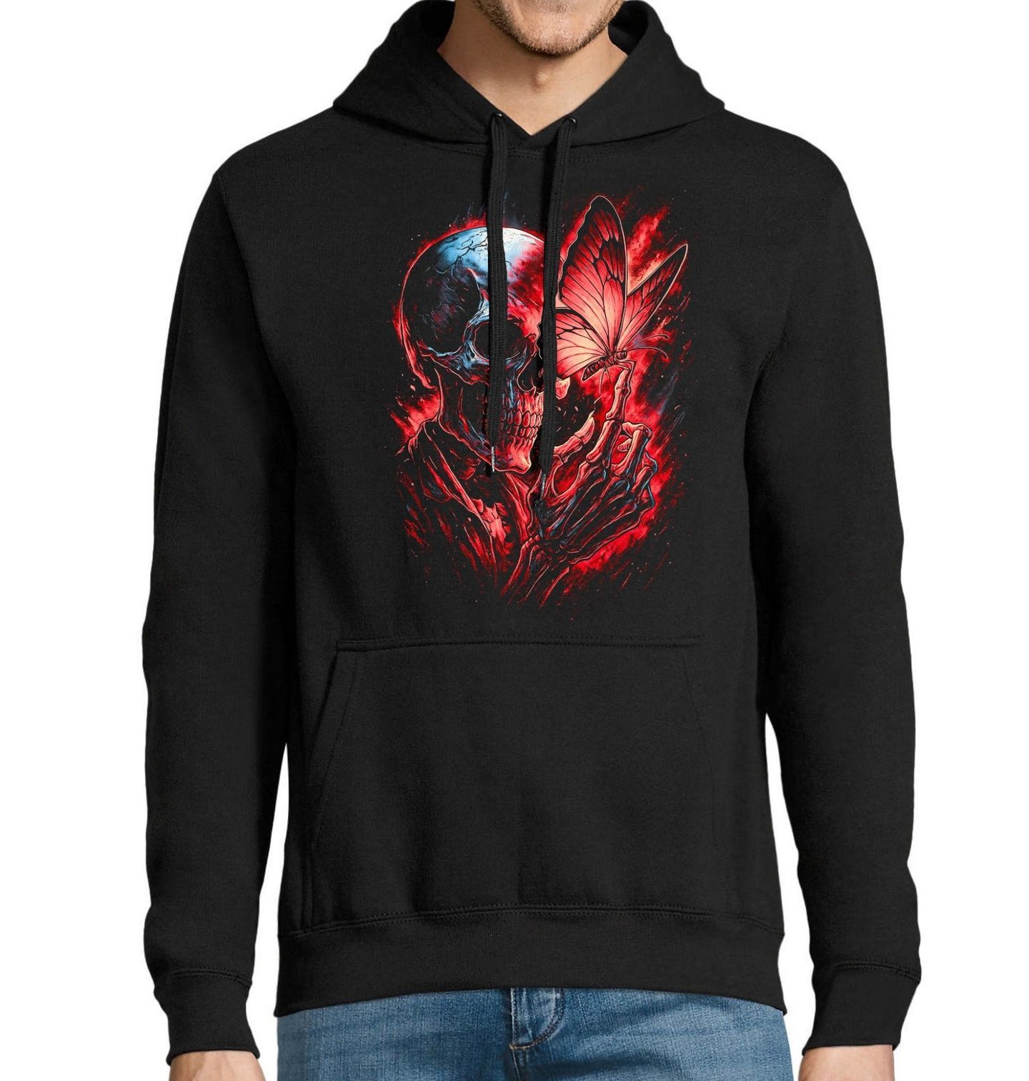Pánská mikina Kostlivec s Motýlem. Silný a zároveň poetický motiv, který spojuje protiklady života a smrti. Na ilustraci vystupuje kostlivec, jenž jemně drží křehkého motýla – symbol proměny, naděje a pomíjivosti. Kontrast mezi temnou postavou a lehkostí motýla vytváří hluboký vizuální i emocionální zážitek. Motiv kostlivec a motýl představuje rovnováhu mezi koncem a novým začátkem.