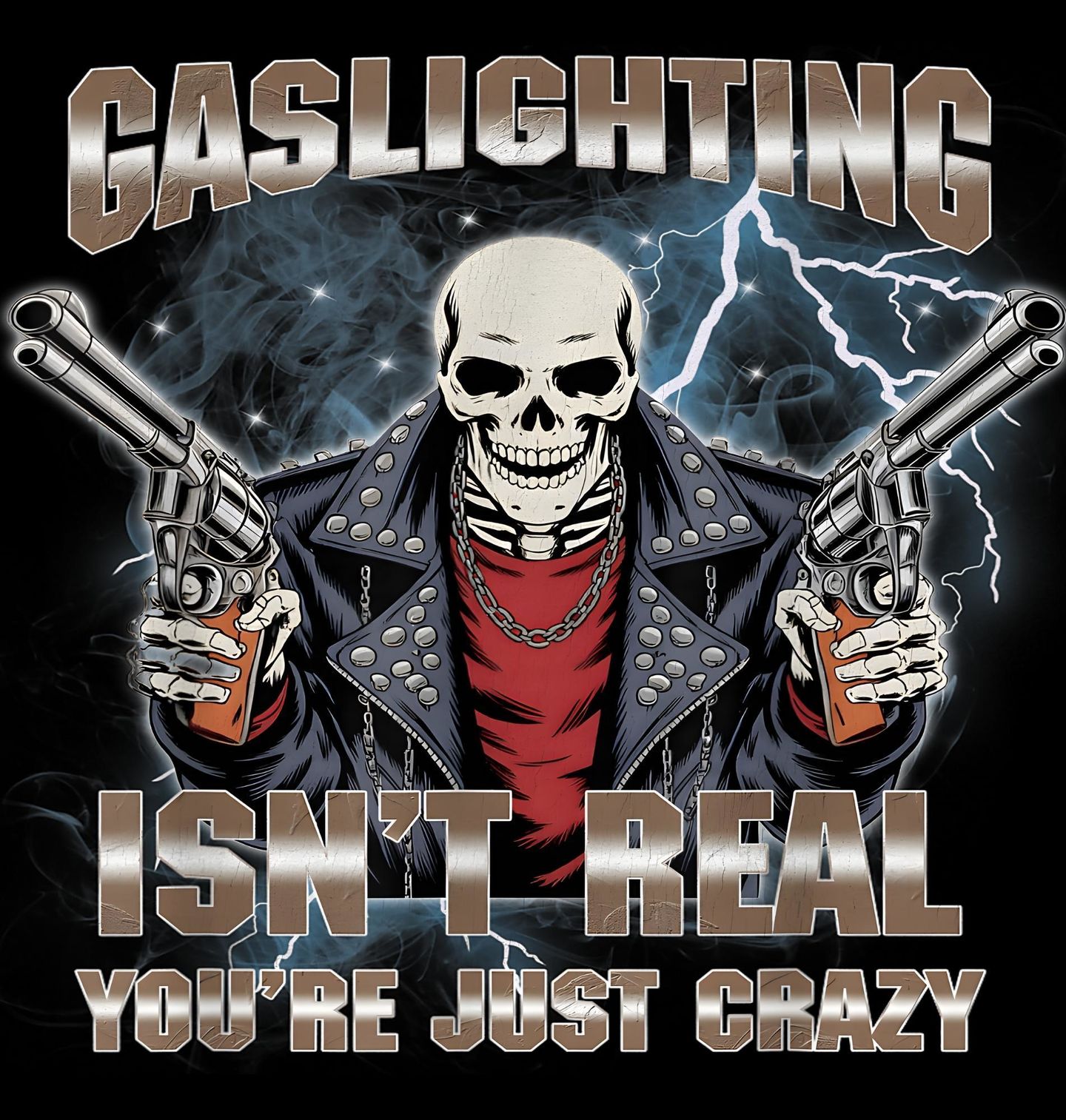 Dámské tričko Kostlivec s Revolvery. „Gaslighting isn’t real, you’re just crazy“ - Manipulace není skutečná, jsi jen blázen. Na motivu je kostlivec v kožené bundě s hroty a řetězy, který drží v obou rukou dvě velké zbraně (revolvery). Ideální pro každého, kdo má rád temnou estetiku, rockový nebo motorkářský styl.
