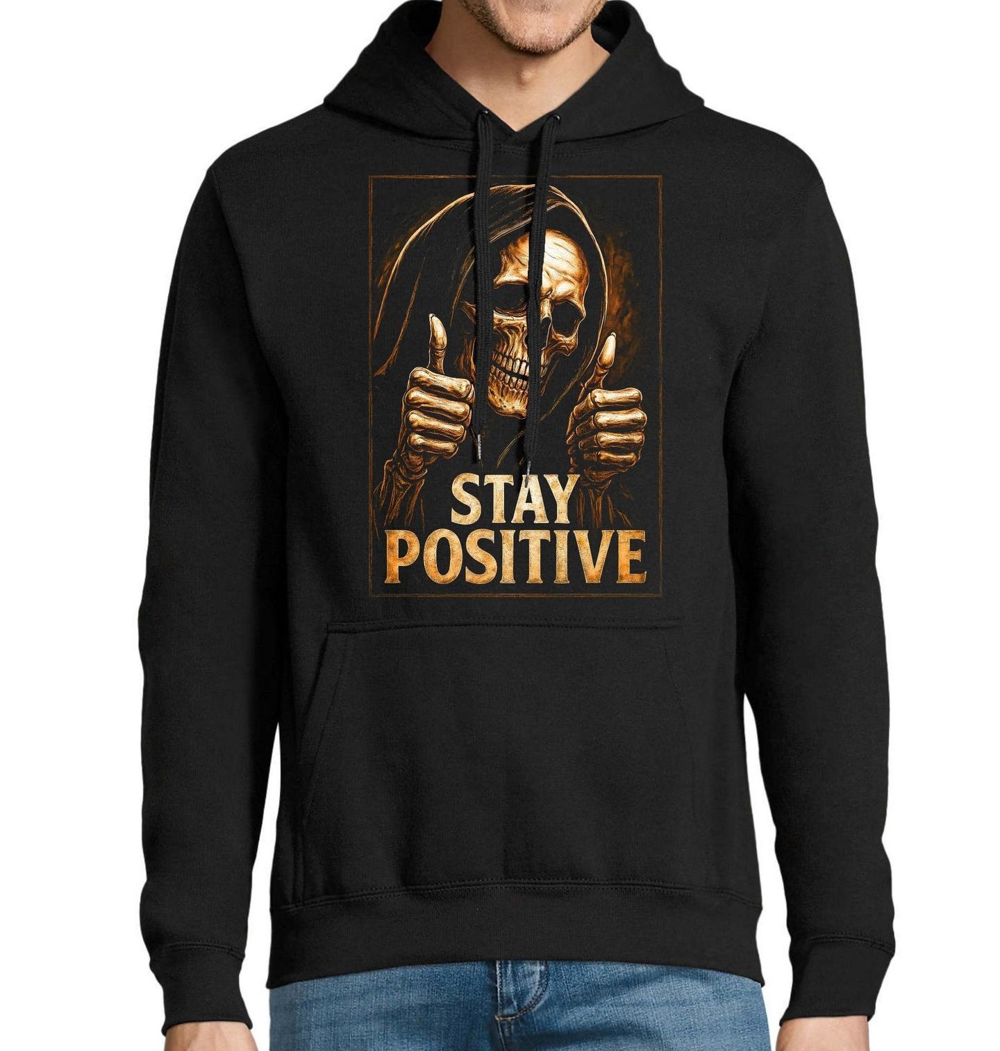 Pánská mikina Kostlivec s Úsměvem Stay Positive. Stylový a lehce ironický motiv zobrazuje postavu, kde kostlivec s kapucí ukazuje palce nahoru a doprovází ho nápis „Stay Positive“. Tento design spojuje temnou estetiku s pozitivním poselstvím, které zaujme každého na první pohled. Skvěle se hodí pro všechny, kdo mají rádi originální grafiku a chtějí vyjádřit optimismus netradičním způsobem.
