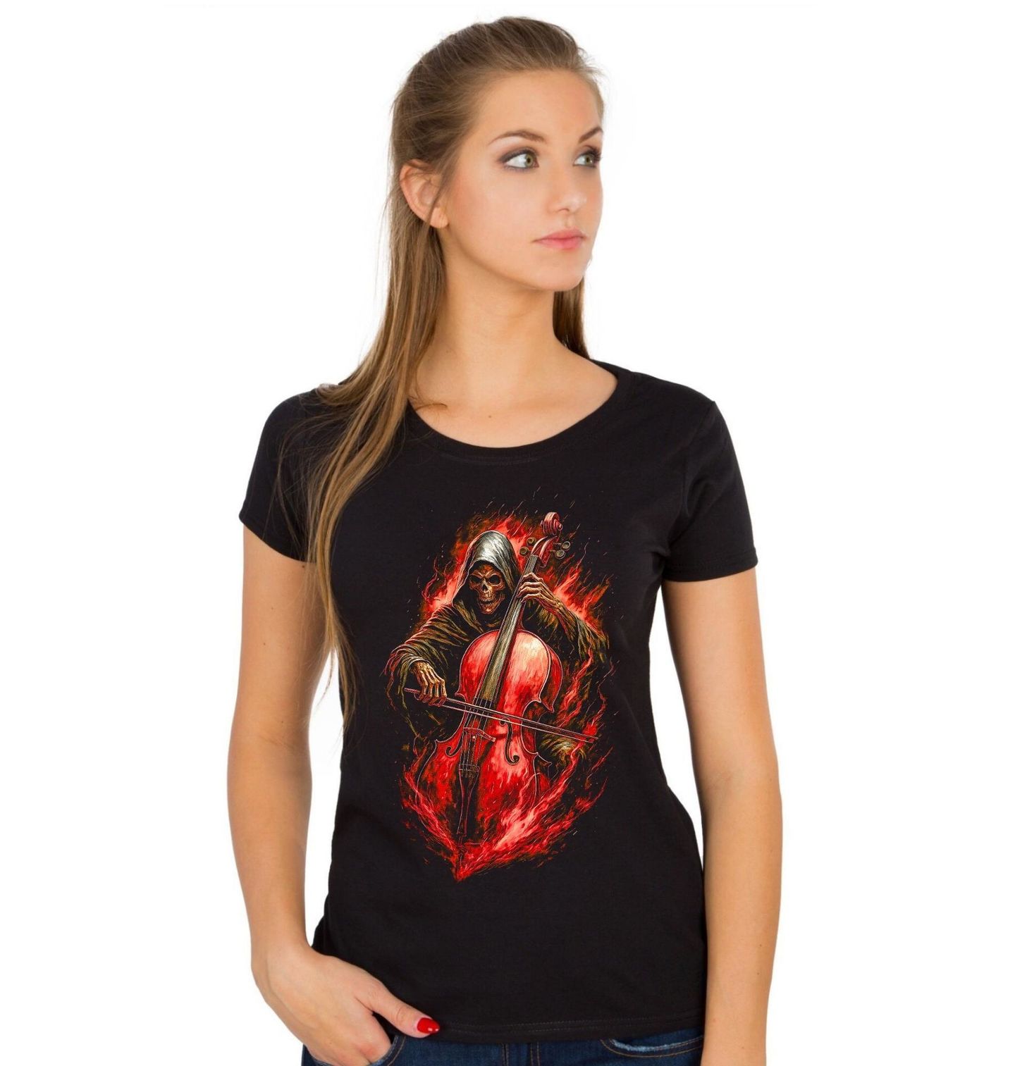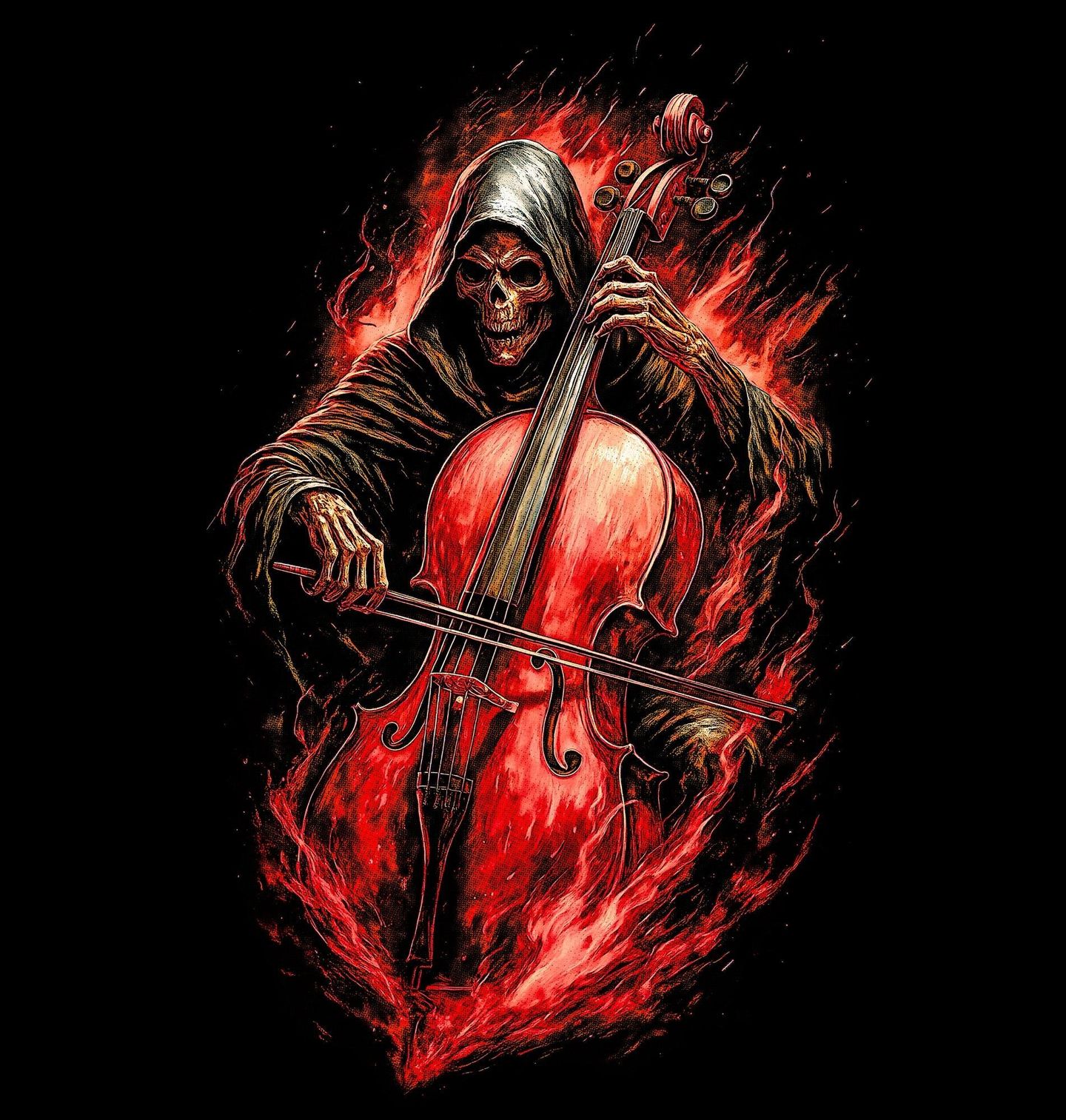 Dámské tričko Kostlivec s Violoncellem. Temný a výrazný motiv, kde kostlivec zahalený v kápi hraje na violoncello, jehož tóny doslova hoří v plamenech. Spojení hudby, ohně a smrti vytváří silnou atmosféru plnou emocí, energie a tajemna. Tento design je ideální pro milovníky hudby, rockového i klasického stylu a všechny, kdo chtějí nosit něco opravdu originálního a nepřehlédnutelného.