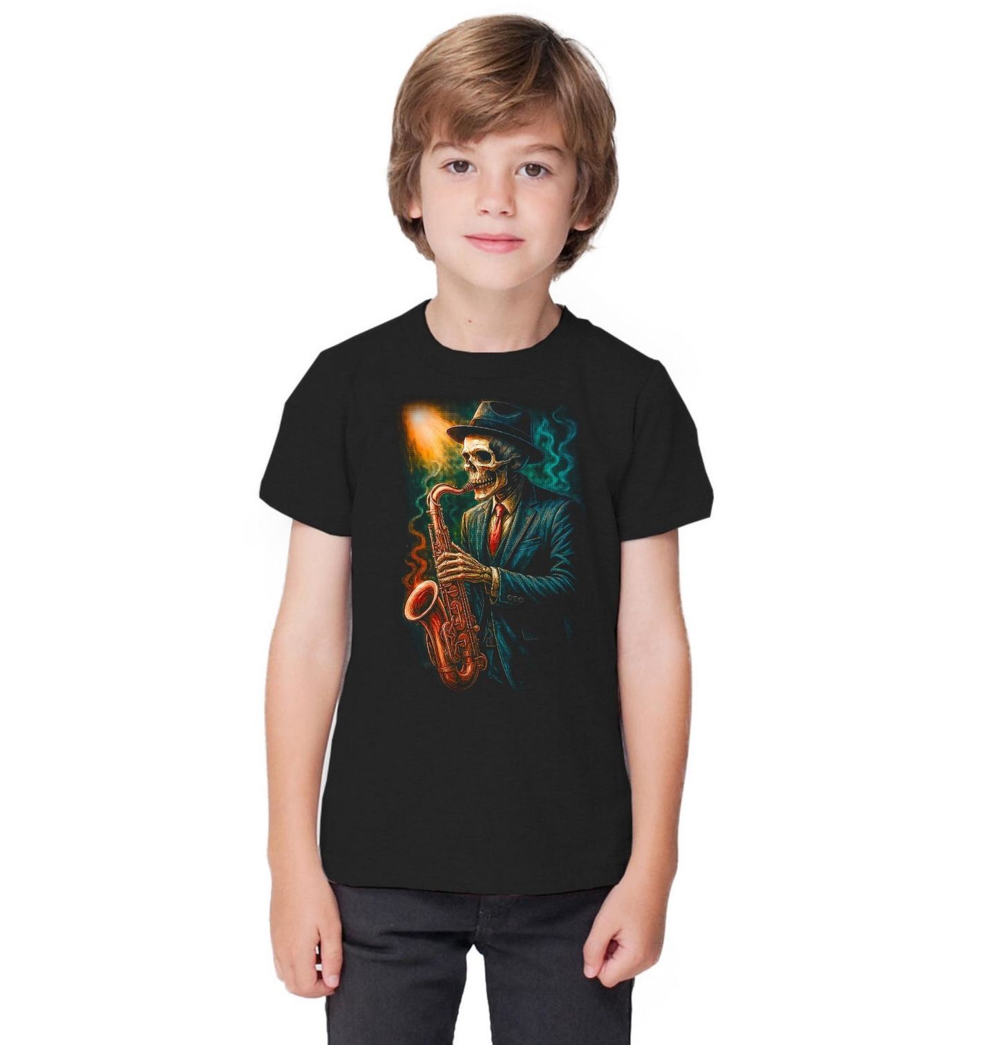 Dětské tričko Kostlivec se Saxofonem. Stylový a atmosférický motiv, kde dominuje kostlivec v elegantním obleku hrající na ikonický saxofon. Tento design spojuje temnou estetiku smrti s energií jazzu a hudby, která nikdy neumírá. Kouřové efekty a dramatické světlo dodávají scéně hloubku a pocit nočního koncertu z jiného světa. Ideální pro milovníky hudby, jazzu a originálních motivů s výrazným charakterem.