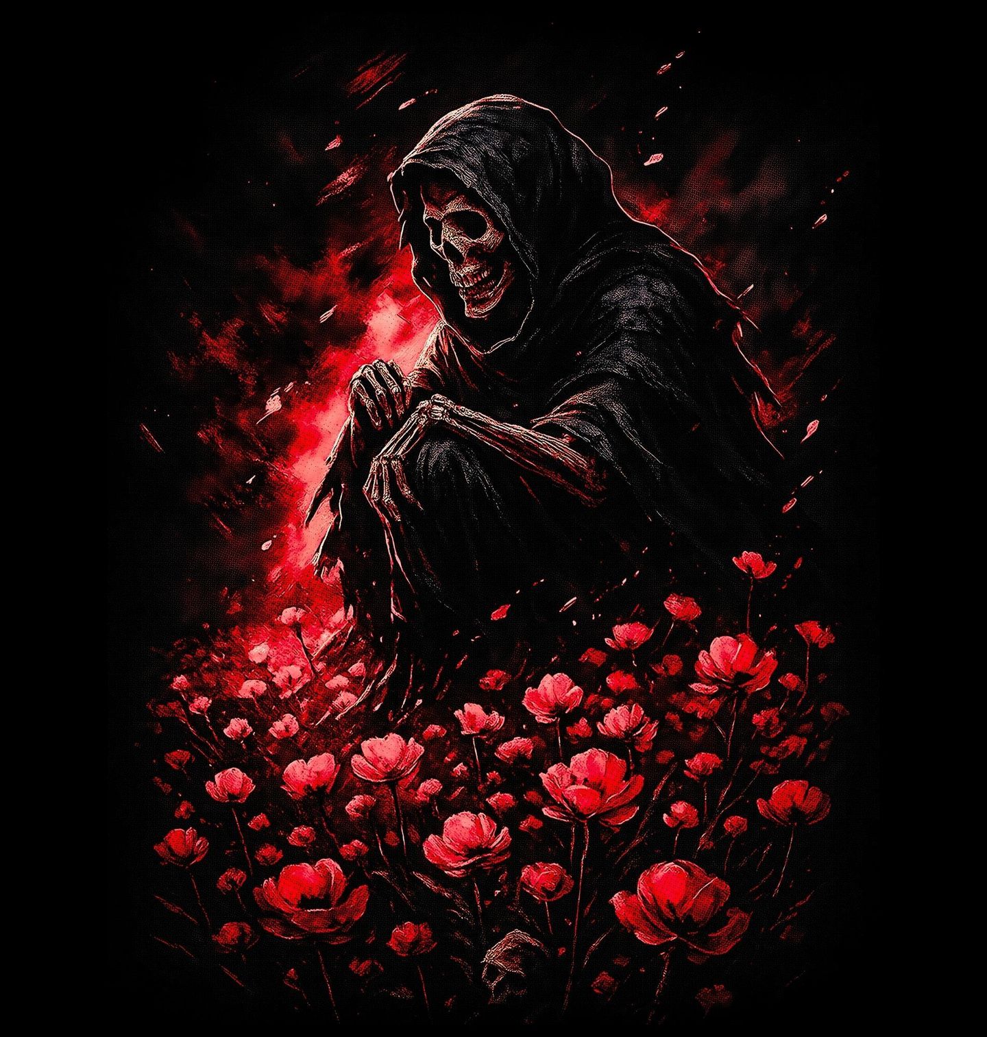 Pánské tričko Kostlivec v Makovém Poli. Silně atmosférický motiv, který spojuje temnotu s křehkou krásou přírody. Na ilustraci sedí kostlivec zahalený v kápi uprostřed pole květů, které připomínají mák. Rudé odstíny vytvářejí dramatickou scénu plnou emocí, klidu i skryté síly. Pokud hledáte design, kde kostlivec v makovém poli vytváří silný vizuální i emoční příběh, tento motiv vás zaujme na první pohled.