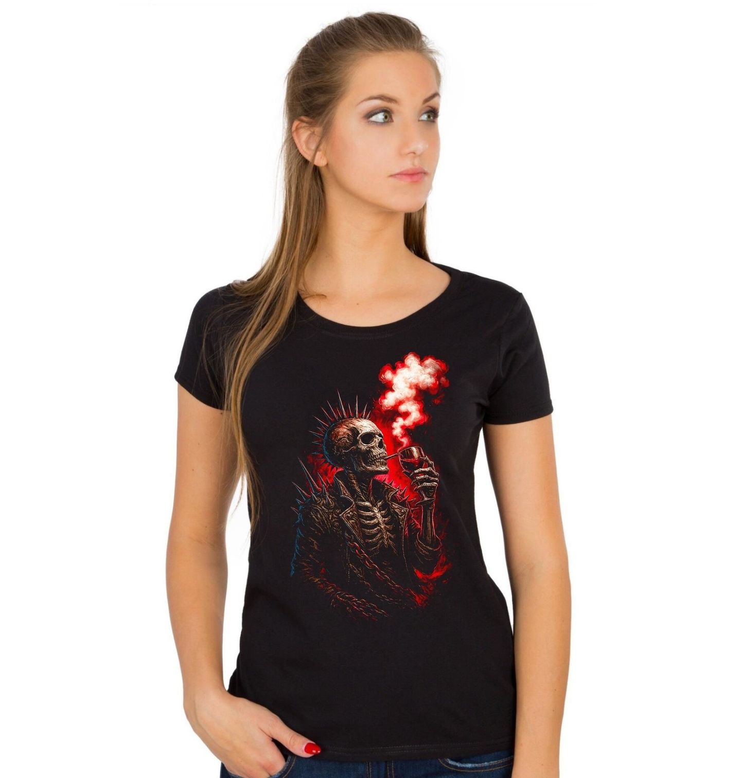 Dámské tričko Kostlivec v Řetězech. Drsný motiv, kde dominuje kostlivec s výraznou lebkou, který si vychutnává svou poslední cigaretu a sklenku vína v punk stylu. Hroty, řetězy a temná atmosféra dodávají designu syrovou energii a pocit absolutní svobody bez pravidel. Tento motiv spojuje rebelii, smrt a životní postoj v jeden silný vizuál, ideální pro všechny, kdo milují punkovou kulturu, temnou estetiku a výrazné grafiky.