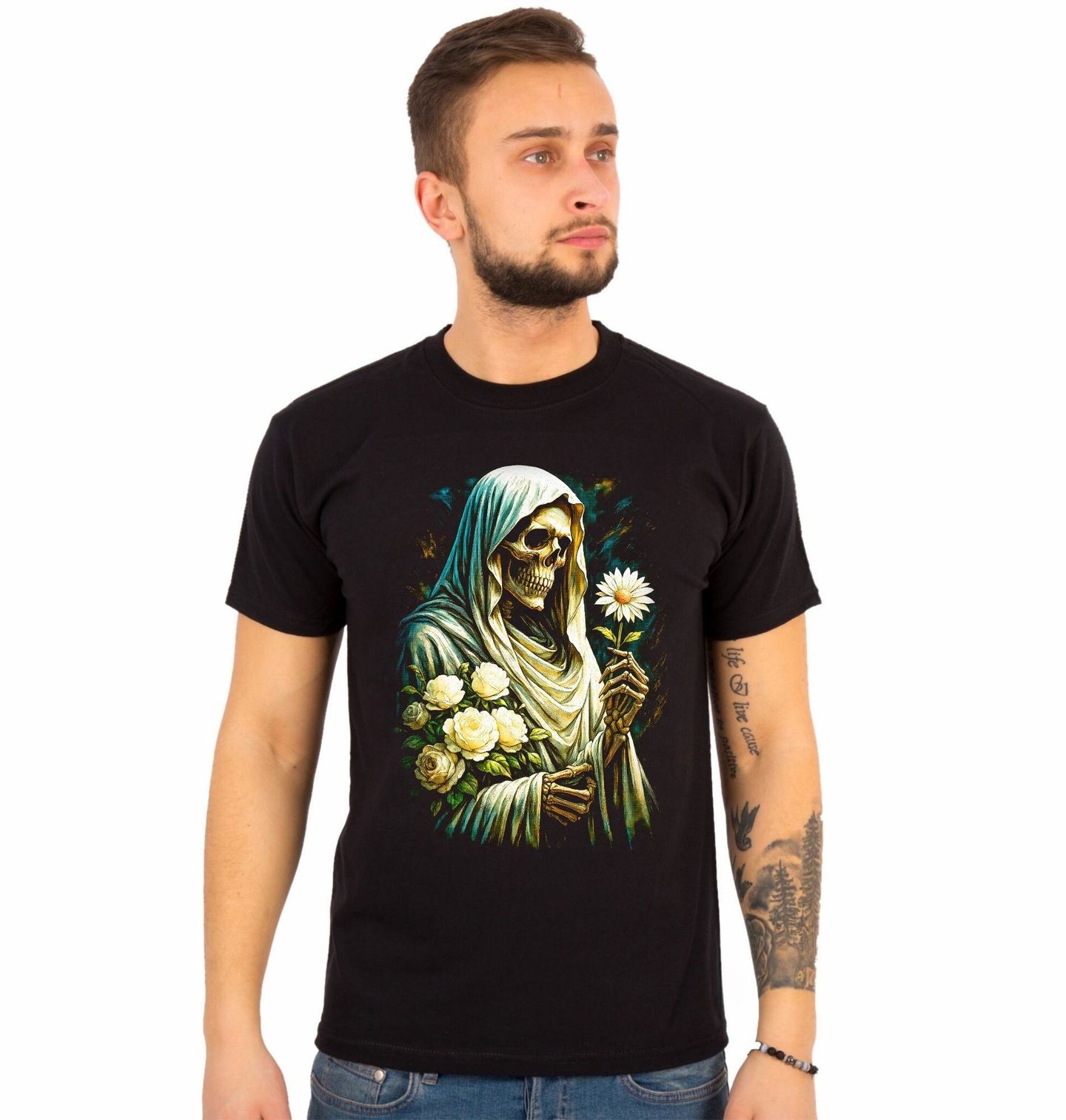 Pánské tričko Kostlivec v Zahradě Věčnosti. Silný a zároveň jemný motiv, který propojuje kontrast života a smrti – kostlivec zahalený v rouše držící květiny představuje harmonii mezi pomíjivostí a krásou. Tento design vyniká detailním zpracováním i citlivým výtvarným stylem, který zaujme na první pohled. Kostlivec zde nepůsobí děsivě, ale spíše klidně a vyrovnaně, zatímco květiny symbolizují naději, nový začátek a cyklus života.