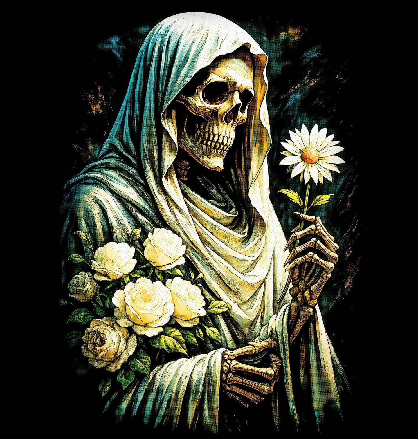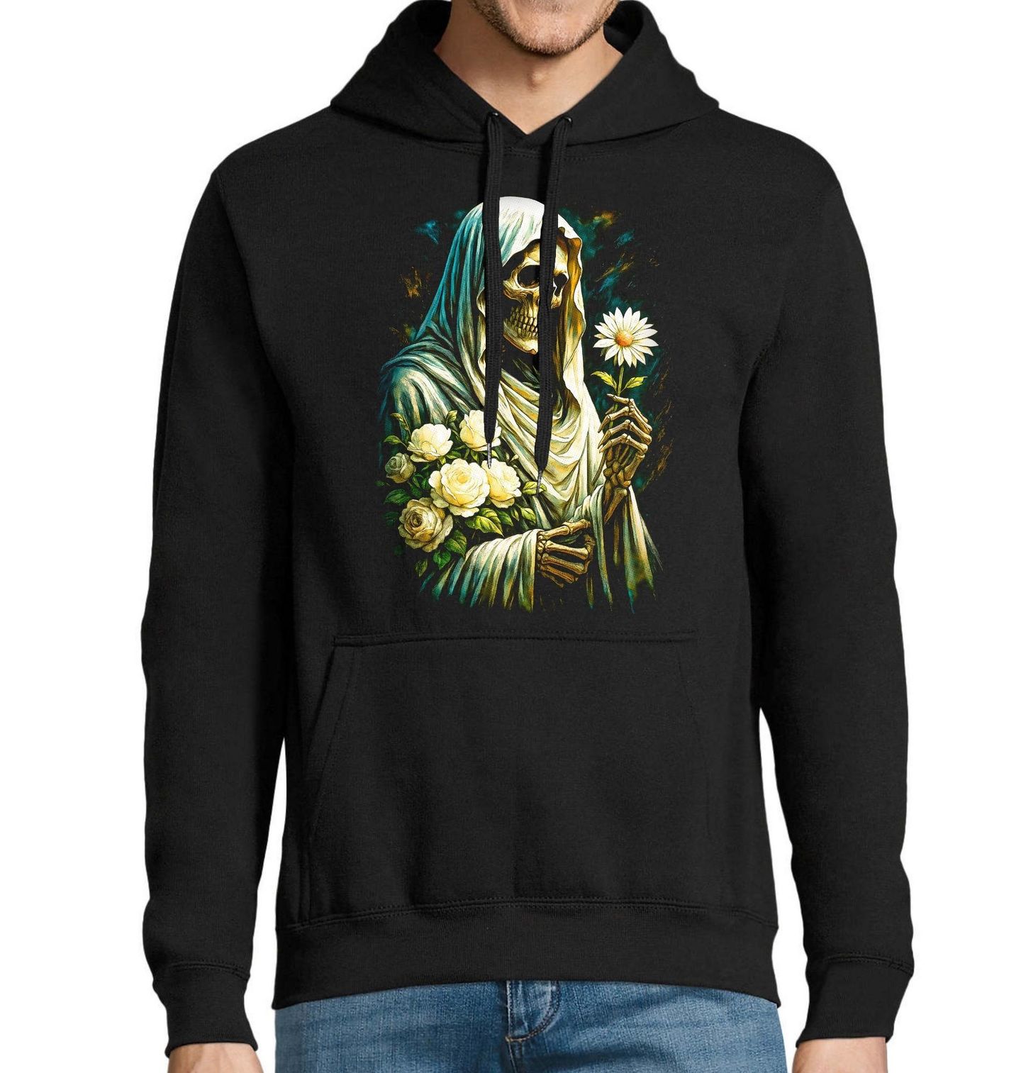 Pánská mikina Kostlivec v Zahradě Věčnosti. Silný a zároveň jemný motiv, který propojuje kontrast života a smrti – kostlivec zahalený v rouše držící květiny představuje harmonii mezi pomíjivostí a krásou. Tento design vyniká detailním zpracováním i citlivým výtvarným stylem, který zaujme na první pohled. Kostlivec zde nepůsobí děsivě, ale spíše klidně a vyrovnaně, zatímco květiny symbolizují naději, nový začátek a cyklus života.