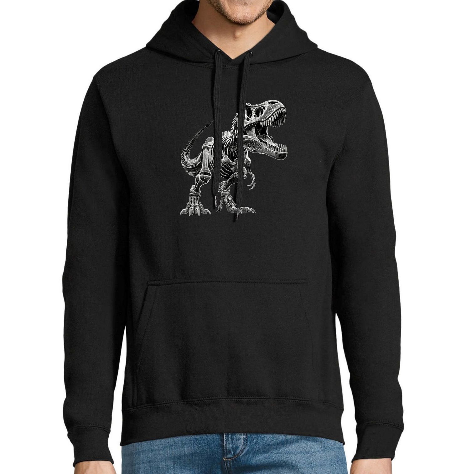 Pánská mikina Kostra Dinosaura T-Rex. Detailní ilustrace slavného dravce Tyrannosaurus rex v podobě kostry působí surově a majestátně, jako by právě vystoupil z muzea přímo na pódium rockového koncertu. Kvalitní potisk a pohodlný střih zaručují, že se hodí na každodenní nošení i jako originální dárek pro milovníky dinosaurů.