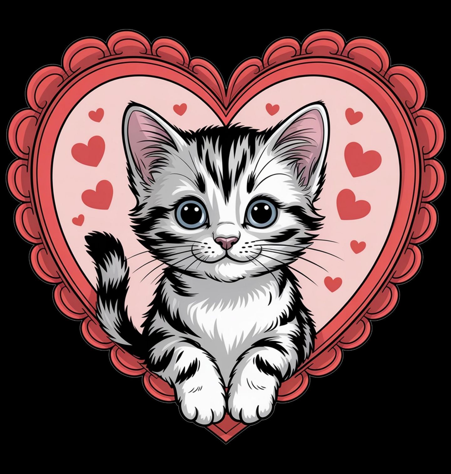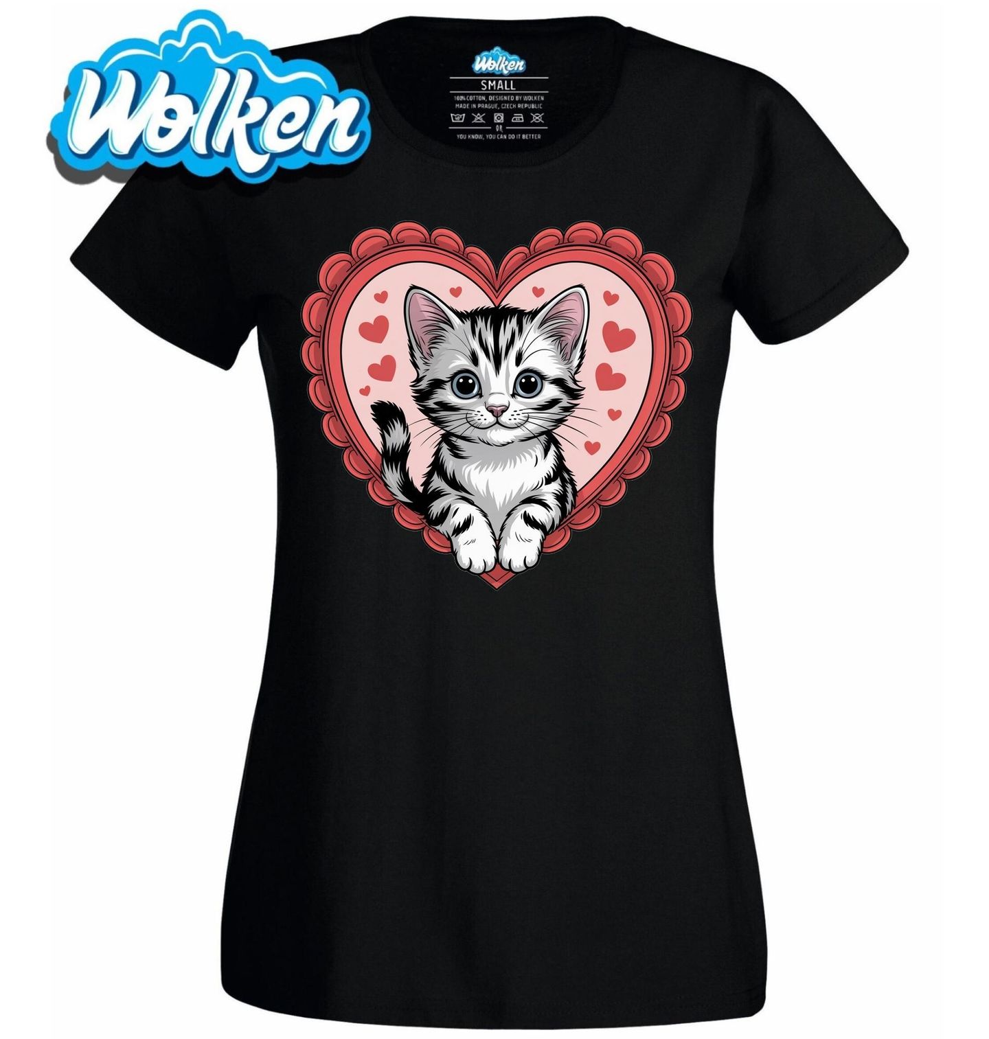 Dámské tričko Koťátko plné Lásky. Roztomilý motiv plný lásky – kočka ukrytá v něžném srdci okouzlí každého milovníka mazlíčků. Tento design spojuje něhu, klid a typickou kočičí zvídavost. Ideální pro ty, kterým kočka rozbuší srdce i na dálku!