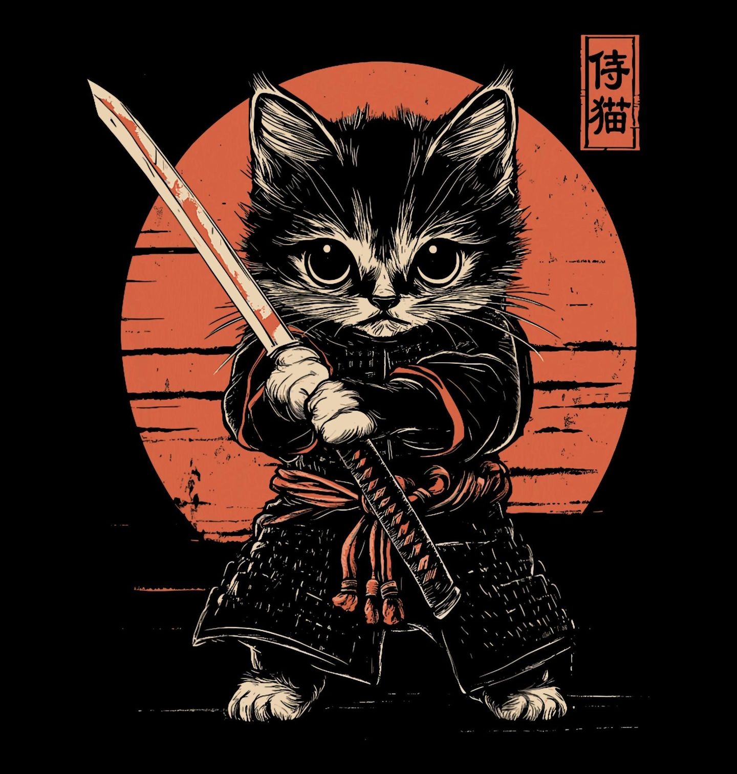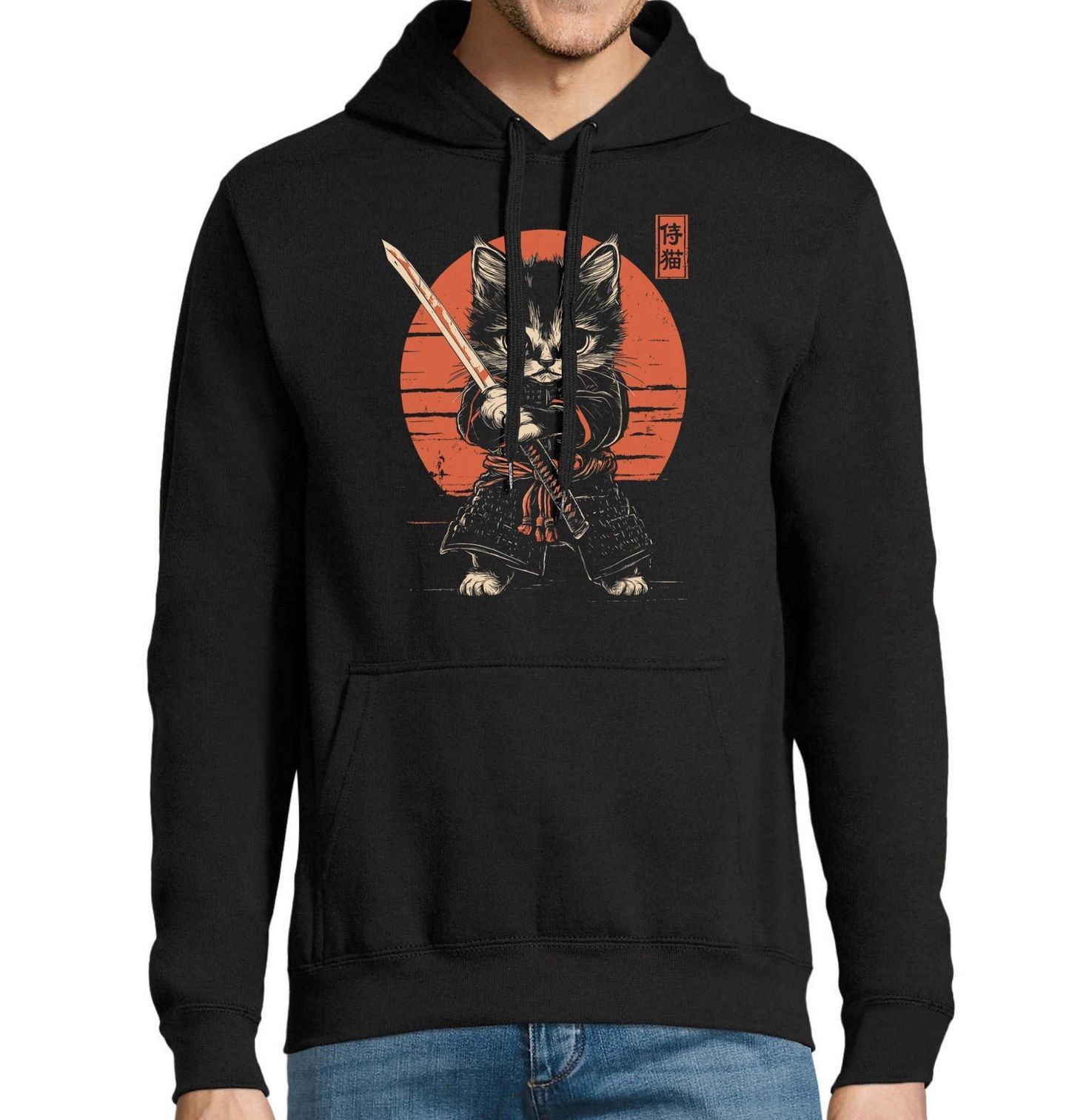 Pánská mikina Kotě Samuraj. Stylový motiv zobrazuje odvážného bojovníka, kde kočka vystupuje jako samuraj držící katanu před zapadajícím sluncem. Design je inspirovaný japonskou estetikou a tradicí samurajů. Japonský nápis na obrázku znamená přibližně „samurajská kočka“ nebo „kočičí samuraj“.