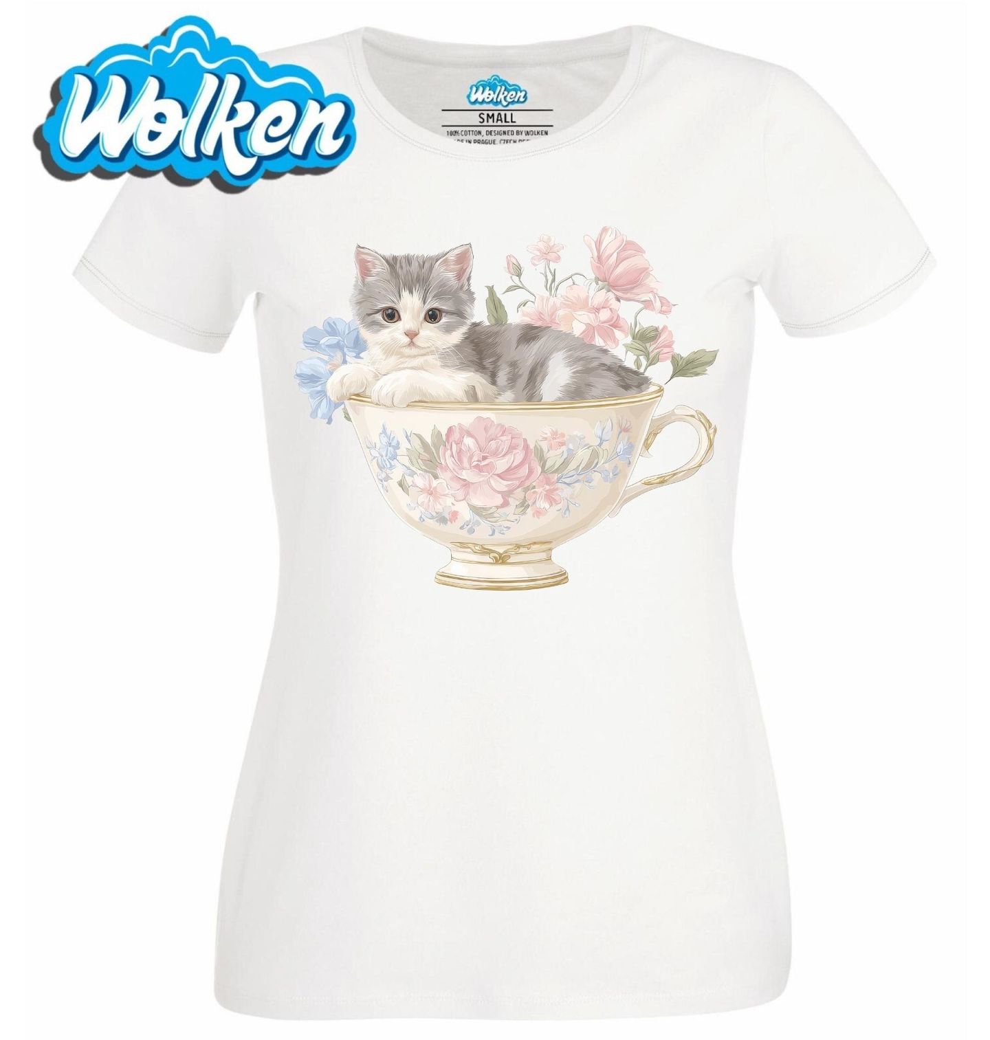 Dámské tričko Kotě v Čajovém Šálku. Roztomilá kočka se pohodlně usadila v jemně zdobeném čajovém šálku obklopeném něžnými květinami. Tento motiv kombinuje eleganci porcelánu a půvab květin s hravostí a něhou kočky, což vytváří unikátní a působivý design.