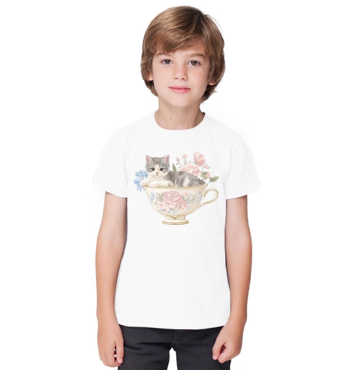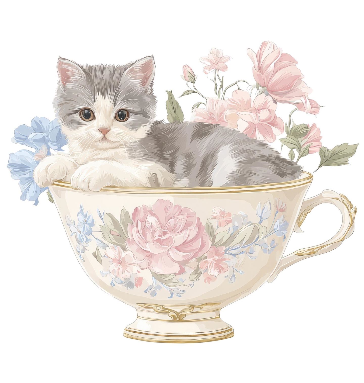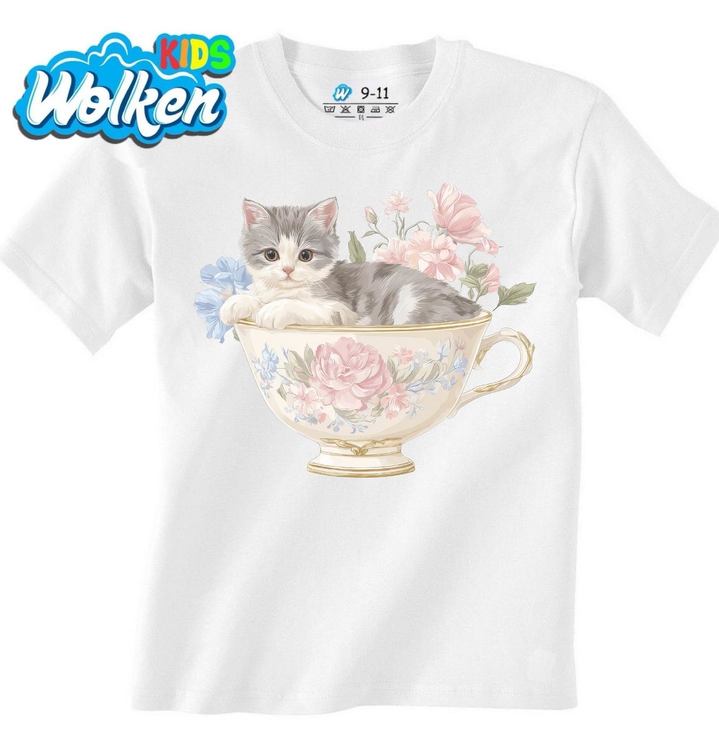 Dětské tričko Kotě v Čajovém Šálku. Roztomilá kočka se pohodlně usadila v jemně zdobeném čajovém šálku obklopeném něžnými květinami. Tento motiv kombinuje eleganci porcelánu a půvab květin s hravostí a něhou kočky, což vytváří unikátní a působivý design.