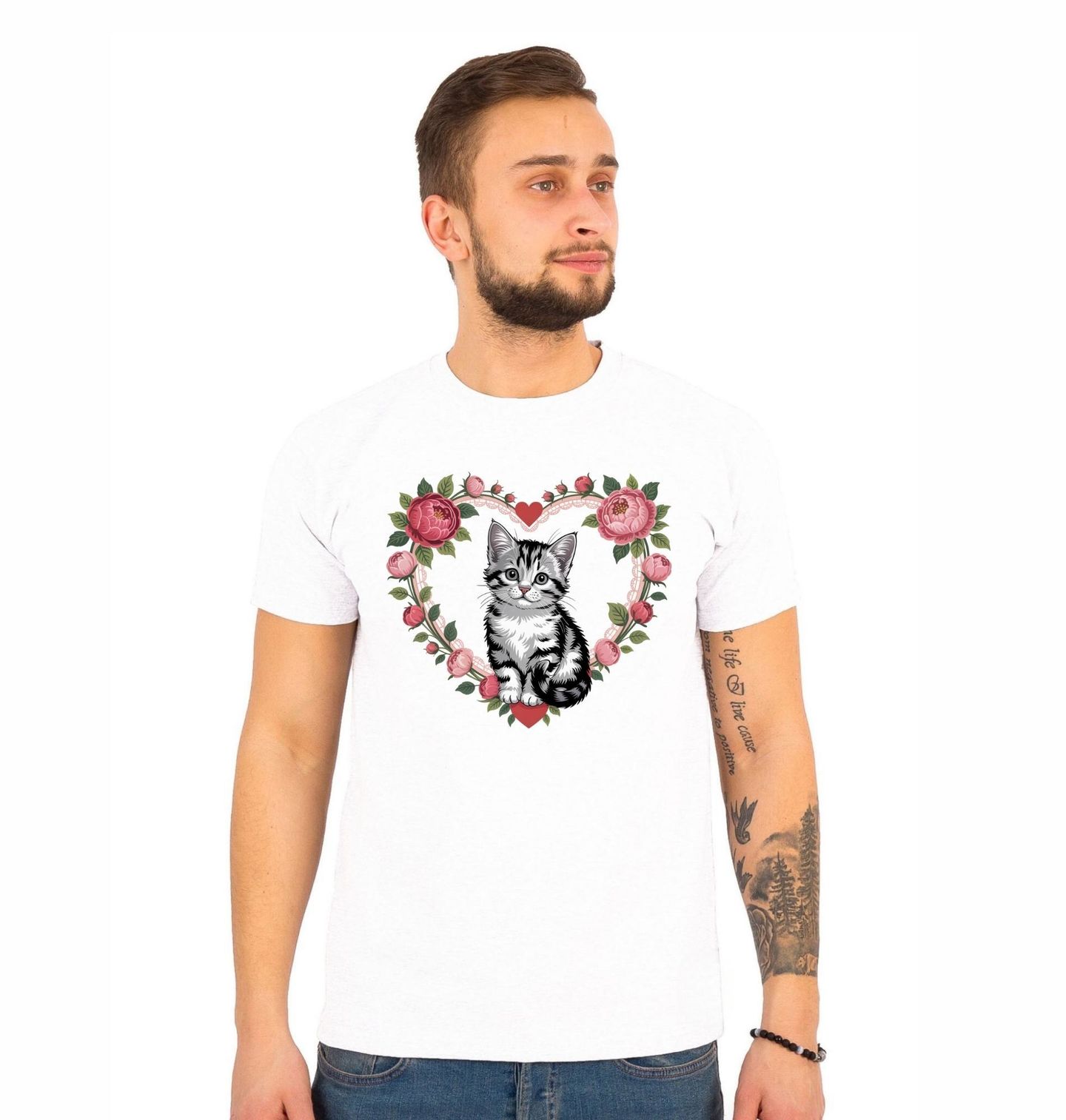 Pánské tričko Kotě v Květinovém Srdci. Detailně ilustrovaná kočka s jemným výrazem sedí v centru květinového srdce tvořeného růžovými pivoňkami, poupátky a zelenými listy. Motiv působí romanticky a zároveň roztomile, díky kontrastu mezi černobílou srstí kočky a barevnou kompozicí květin.