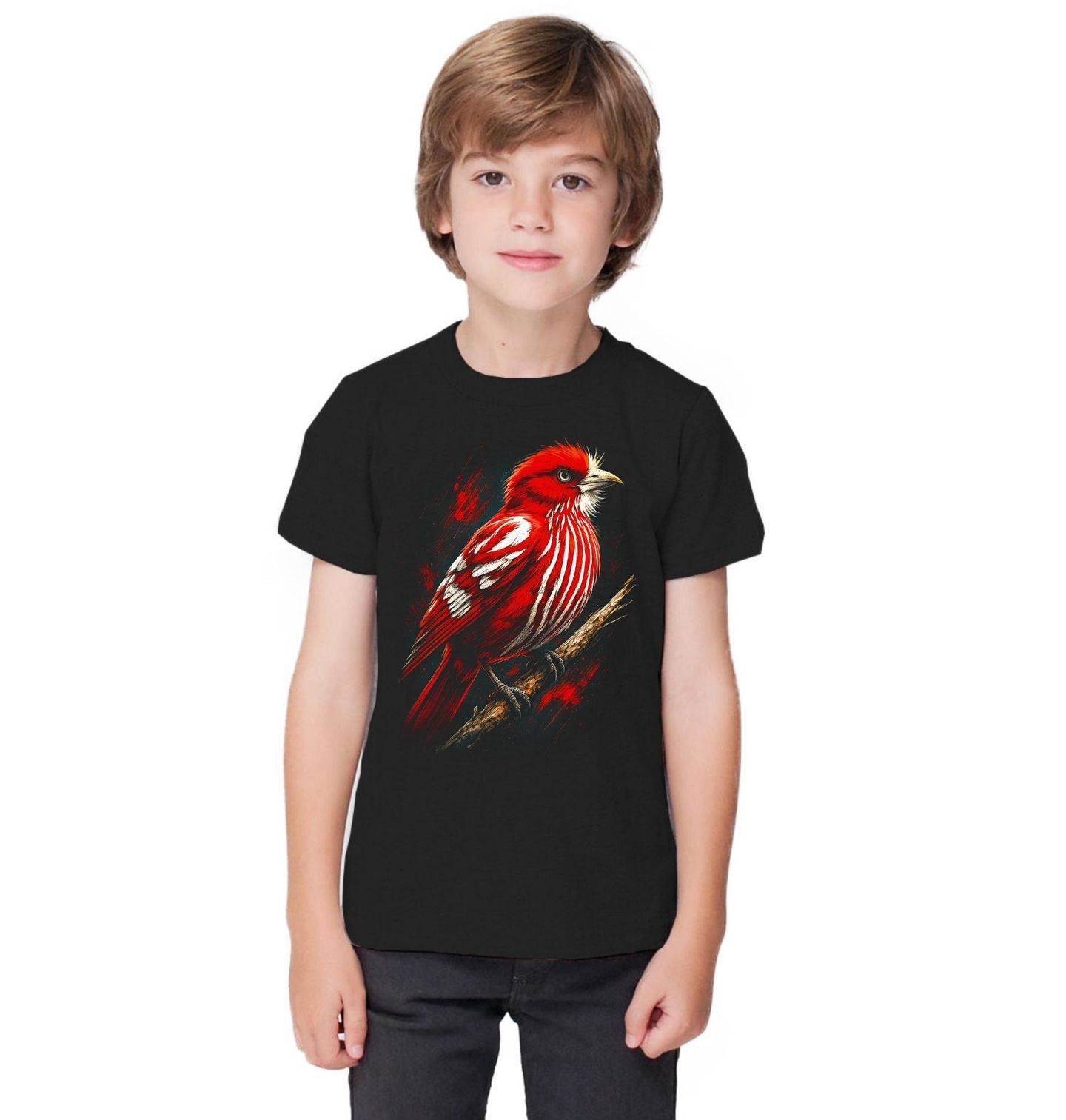 Dětské tričko Kotinga vínorudá. Tento výrazný motiv zobrazuje pták v uměleckém a symbolickém pojetí, inspirovaném tropickými druhy Jižní Ameriky, především rodem Cotinga. Sytě červené zbarvení, kontrastní bílé tahy a tmavé pozadí vytvářejí silný vizuální dojem plný energie, elegance a exotiky.
