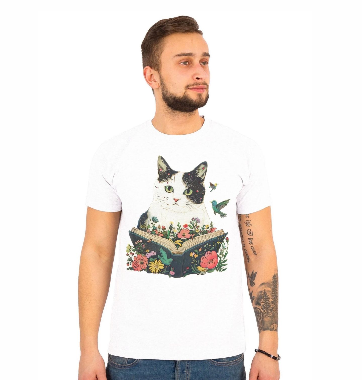 Pánské tričko Kouzelná Kočka s Knihou a Ptáčky. Tento detailně zpracovaný design propojuje svět fantazie, čtení a přírody do jedinečné harmonie. Kočka zde působí moudře a klidně, zatímco kniha symbolizuje příběhy, poznání a nekonečné možnosti. Ptáčci dodávají motivu lehkost, volnost a jemný pohyb, který celý obraz krásně oživuje. Ideální volba pro milovníky knih, přírody a něžných ilustrací.