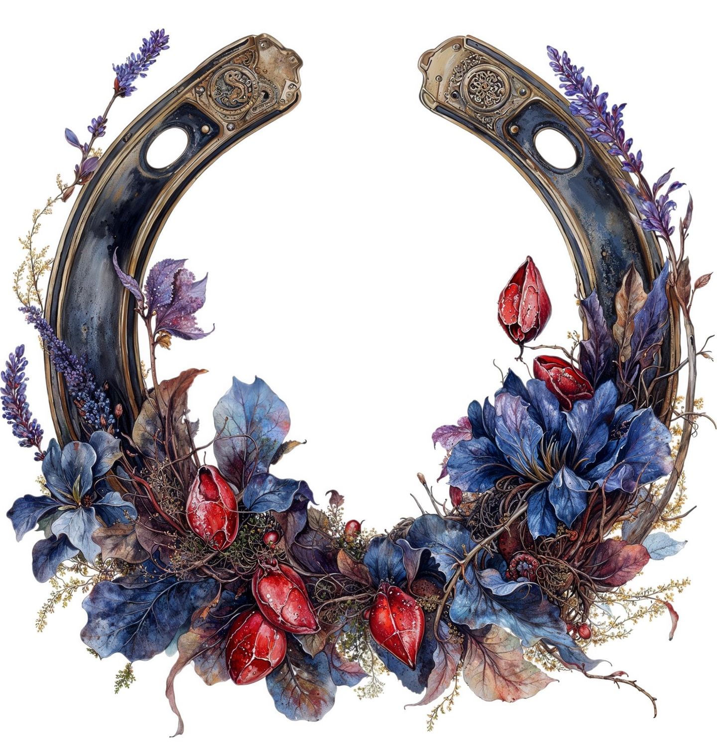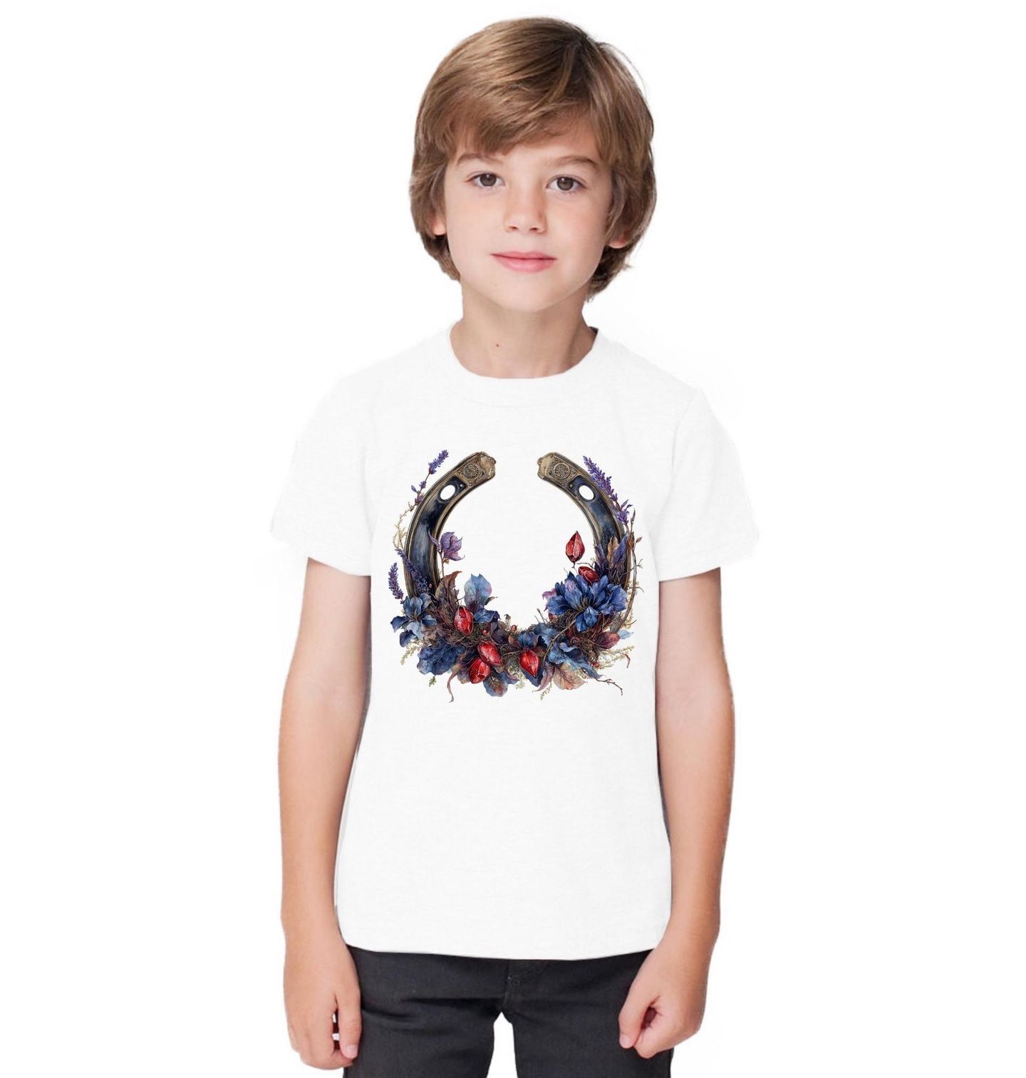 Dětské tričko Kouzelná Podkova Štěstí. Elegantní motiv spojuje symboliku štěstí a krásu přírody v jedinečném designu. Dominantní podkova, tradiční talisman pro štěstí, je zdobená bohatou kompozicí listů, květů a plodů v hlubokých modrých a červených tónech. Podkova je od nepaměti spojována s ochranou, štěstím a silou, kterou představuje kůň jako ušlechtilé a silné zvíře.