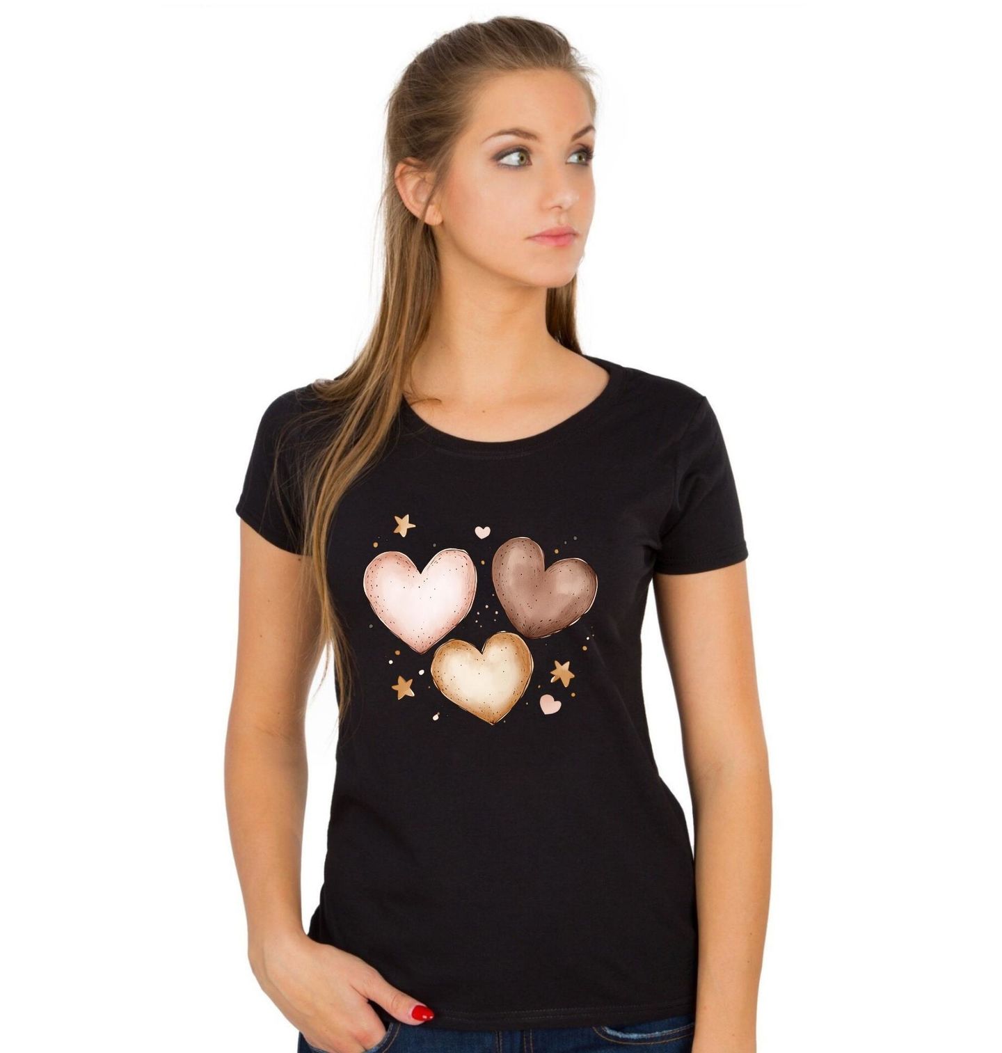 Dámské tričko Kouzelná Srdce Lásky. Roztomilý a jemný motiv tří pastelových srdcí doplněných o drobné hvězdičky je jako stvořený pro všechny romantické duše. Tento design vyjadřuje, co je nejdůležitější – láska. Hlavním prvkem je srdce v měkkých, hřejivých odstínech, díky kterým motiv působí něžně a elegantně. Ideální pro Valentýn i každý den, kdy chceš ukázat, že láska je všude kolem nás.