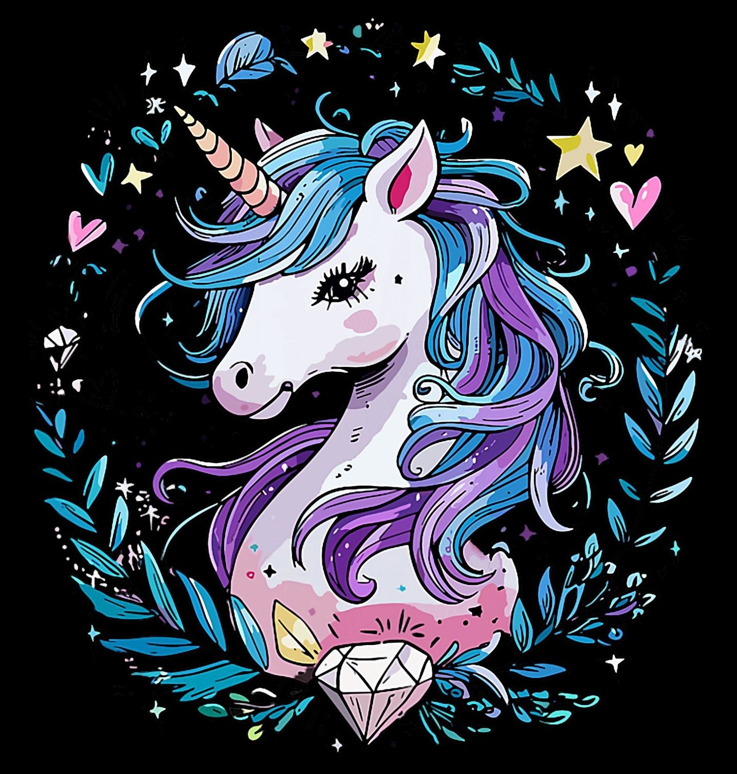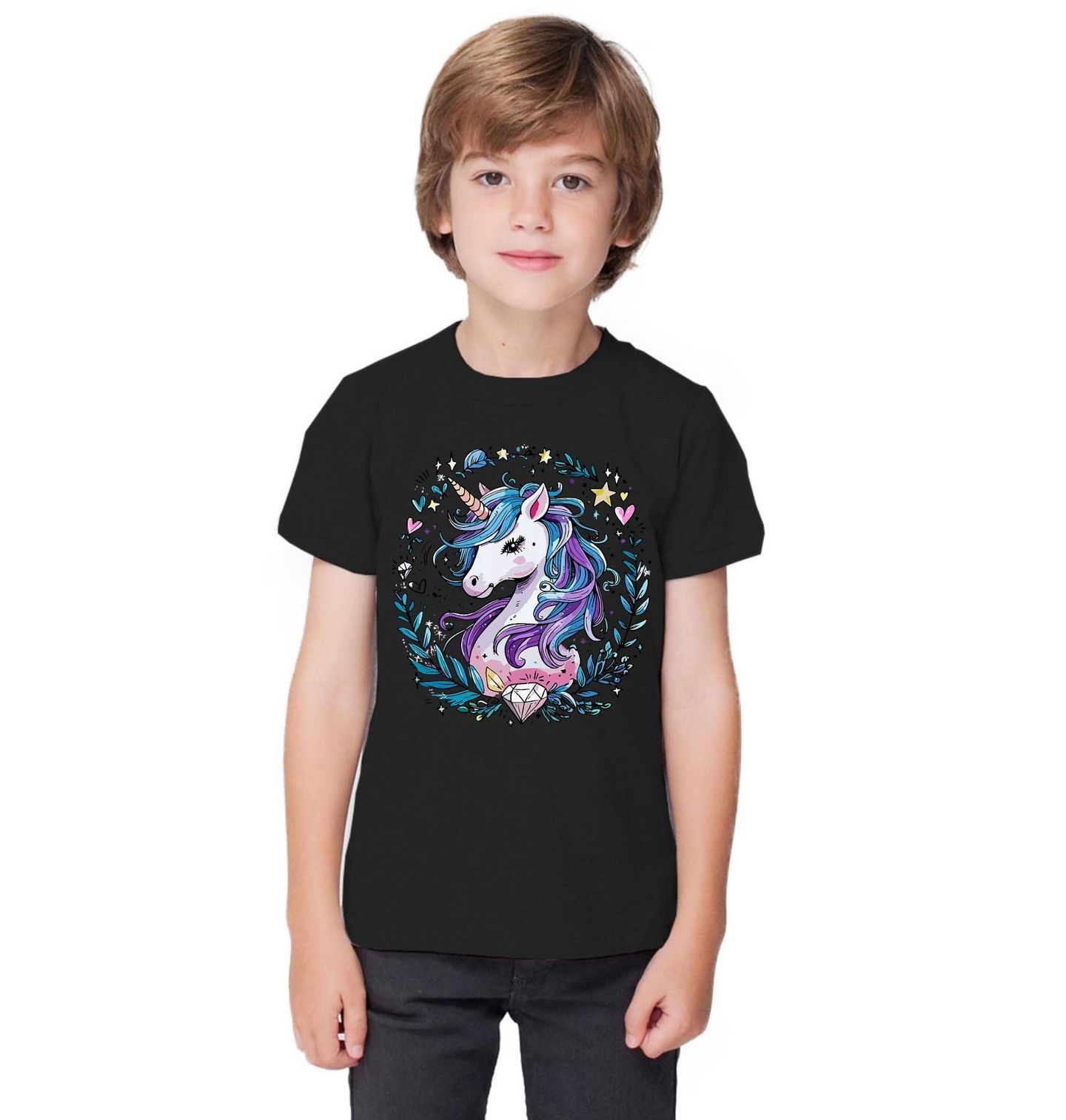 Dětské tričko Kouzelný Jednorožec. Tento roztomilý a barevný potisk zaujme každé dítě, které miluje pohádky, fantazii a magická stvoření. Jednorožec s duhovou hřívou, třpytkami, srdíčky a diamantem přináší radost a styl do každodenního nošení.