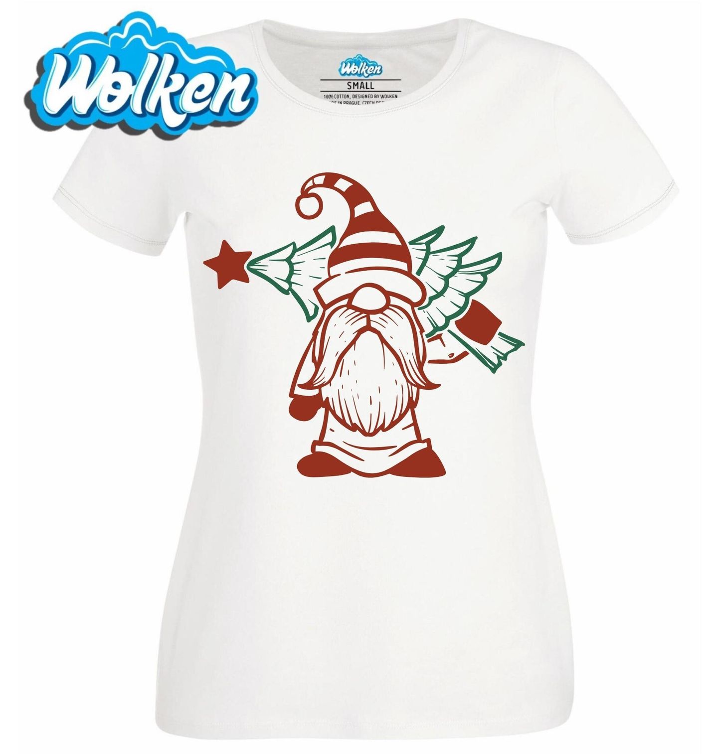 Dámské tričko Kouzelný Vánoční Skřítek. Roztomilý motiv pro všechny milovníky severské vánoční atmosféry! Tento skandinávský gnome s dlouhým plnovousem a čepicí v červených a zelených barvách nese malý vánoční stromeček ozdobený hvězdou. Vánoce jsou díky němu hřejivé, hravé a plné kouzla.