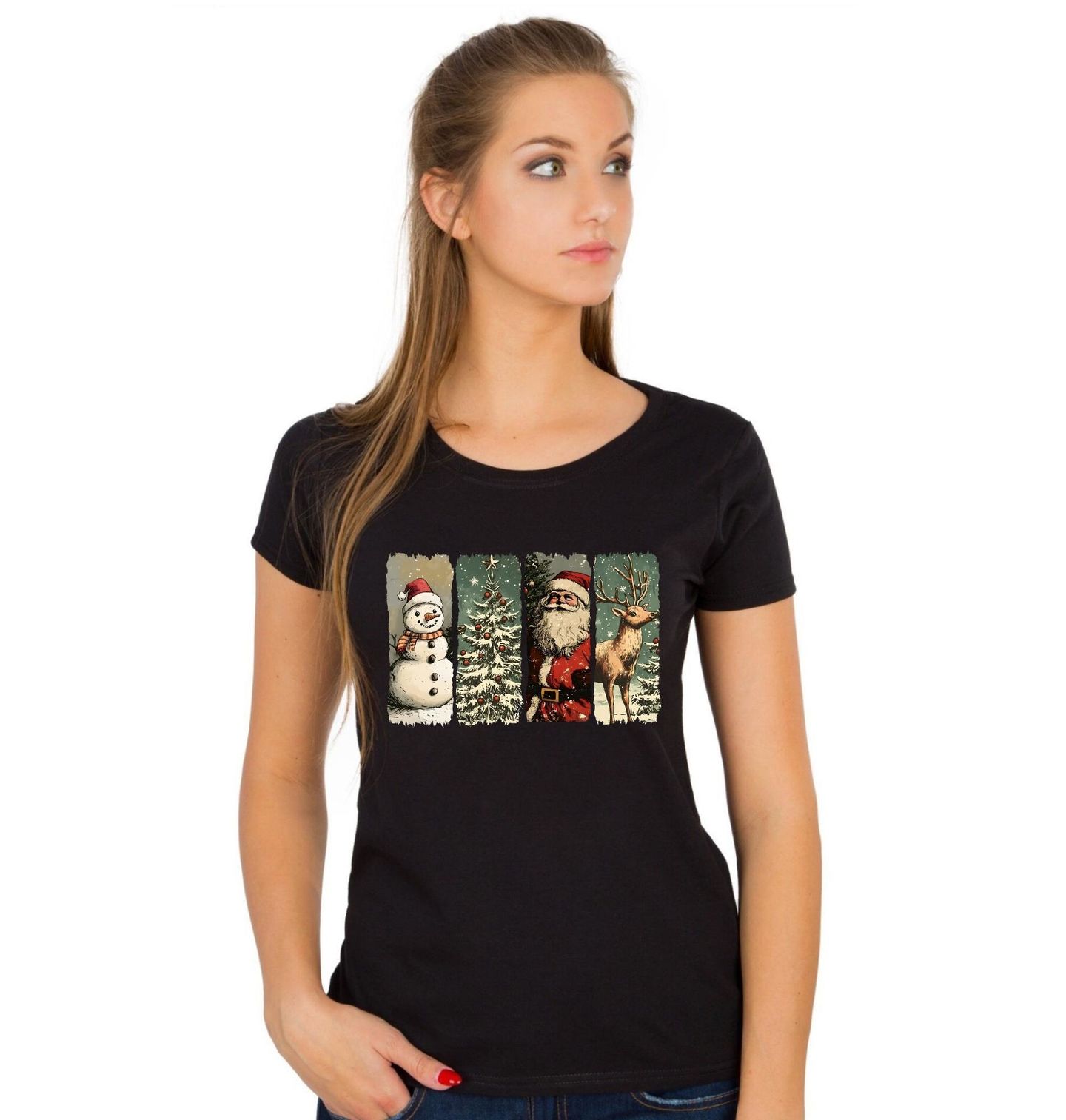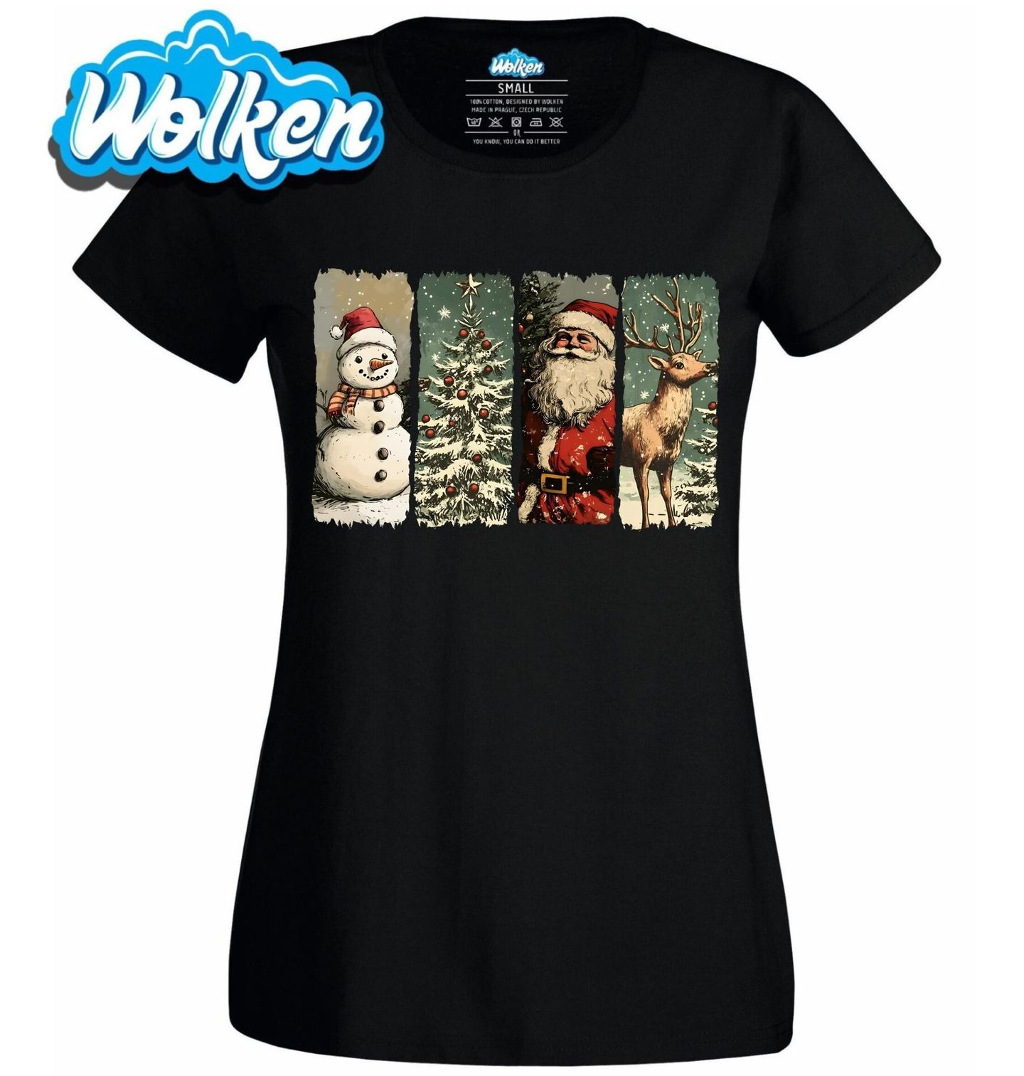 Dámské tričko Kouzlo Vánoc. Vánoční motiv zpracovaný jako čtyřdílný polyptych, který zachycuje zasněženého sněhuláka, ozdobený vánoční stromek, veselého Santu a elegantního jelena. Ideální volba pro všechny milovníky Vánoc, kteří hledají originální a hravý design s vánoční tematikou. Vánoce, jak je milujeme.