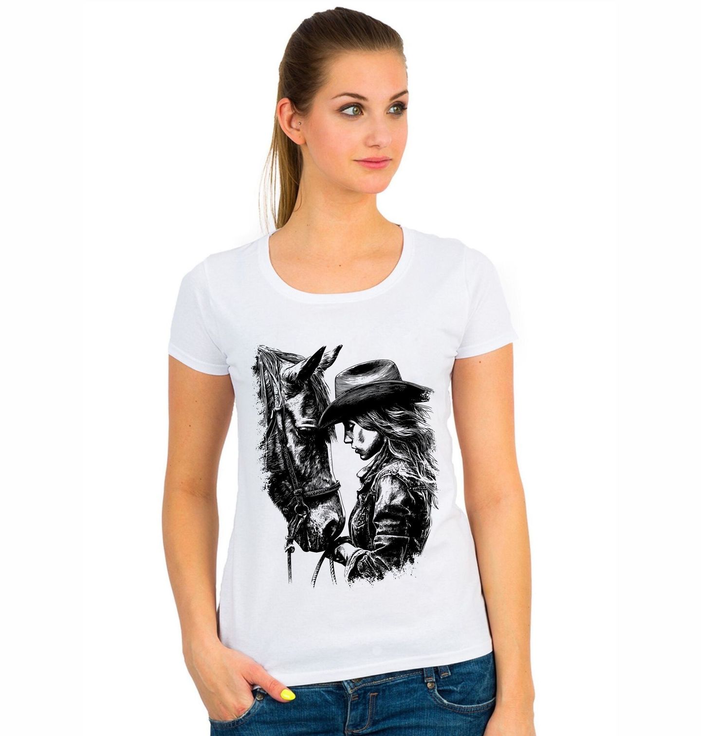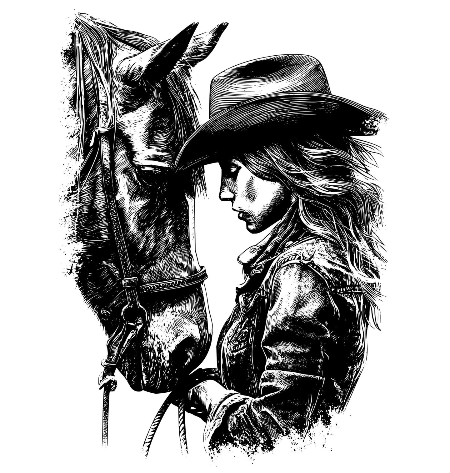 Dámské tričko Kovbojka a Kůň. Silný a emotivní design zobrazující ženu a koně v detailní černobílé kresbě. Motiv vyzařuje spojení člověka a zvířete a lásku k westernovému stylu. Ideální pro milovníky koní, westernu a rodeo stylu.
