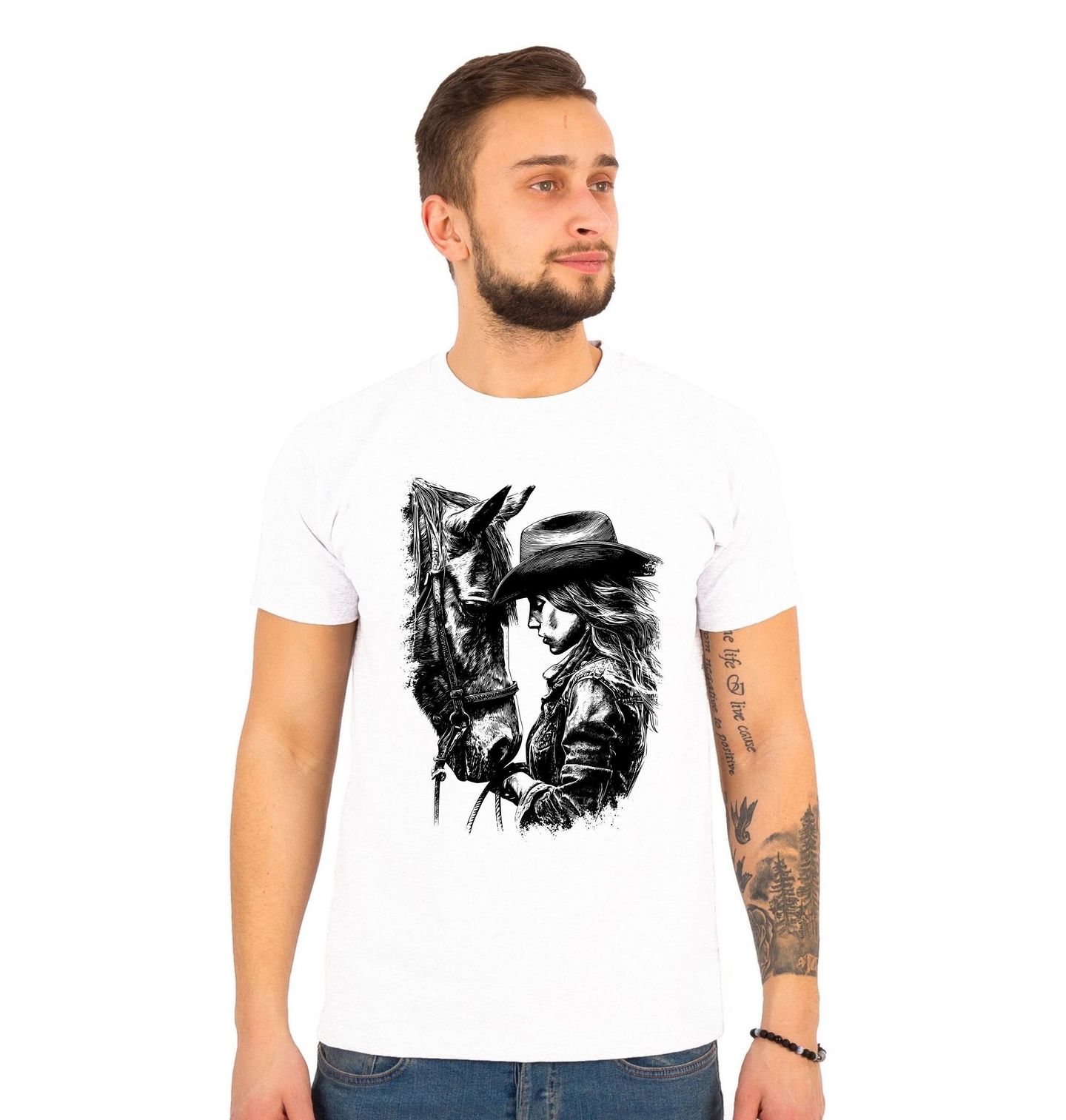 Pánské tričko Kovbojka a Kůň. Silný a emotivní design zobrazující ženu a koně v detailní černobílé kresbě. Motiv vyzařuje spojení člověka a zvířete a lásku k westernovému stylu. Ideální pro milovníky koní, westernu a rodeo stylu.