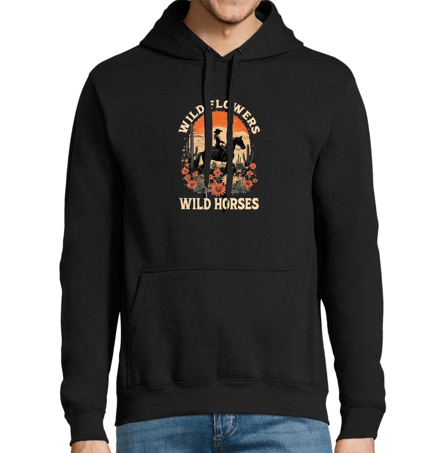 Pánská mikina Kovbojka na Koni. „WILD FLOWERS – WILD HORSES“ česky „Divoké květiny – Divocí koně“. Vychutnej si divoký západ na vlastní kůži! Tento westernový motiv zachycuje siluetu kovbojky na koni projíždějící pouští plnou kaktusů a divokých květin. Spojení volnosti, síly a krásy přírody je ideální pro milovníky westernového stylu, přírody a samozřejmě – koně.