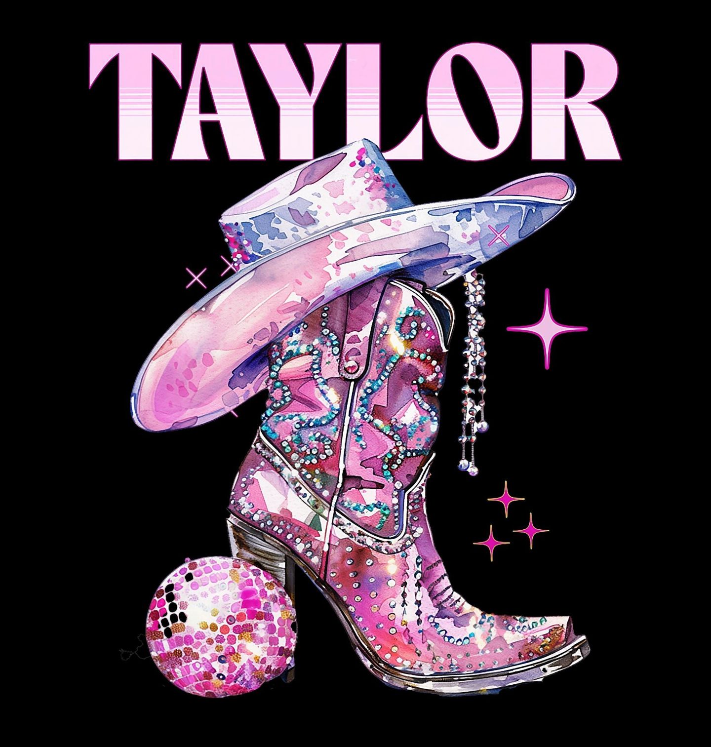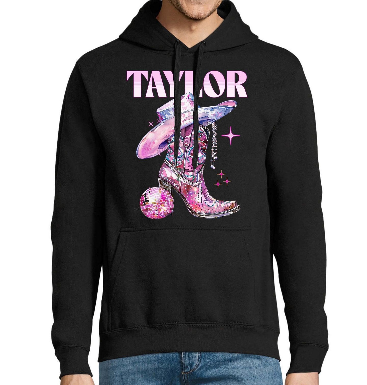 Pánská mikina Kovbojská Taylor. Růžový motiv s textem „Taylor“ doplněný o kovbojský klobouk a botu v třpytivém designu je vhodným dárkem pro každého fanouška známé americké zpěvačky Taylor Swift.