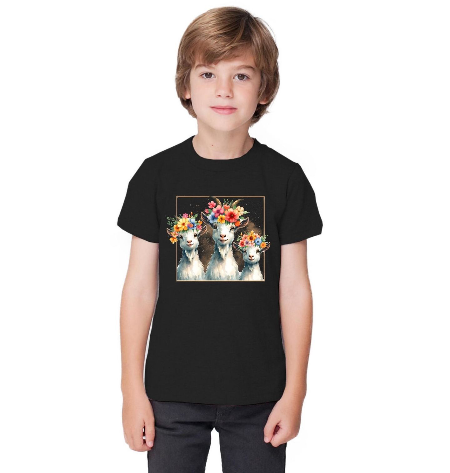 Dětské tričko Kozy s Květinovou Korunou. Tento roztomilý a veselý motiv zobrazuje tři usměvavé kozy s barevnými věnečky z jemných květiny. Ilustrace působí přátelsky, hravě a připomíná pohodu, kterou dokáže nabídnout jen venkov a farma. Barevné květy, jemné detaily a něžné výrazy zvířat vytvářejí motiv, který zahřeje u srdce každého milovníka přírody, zvířat a klidného života na statku.
