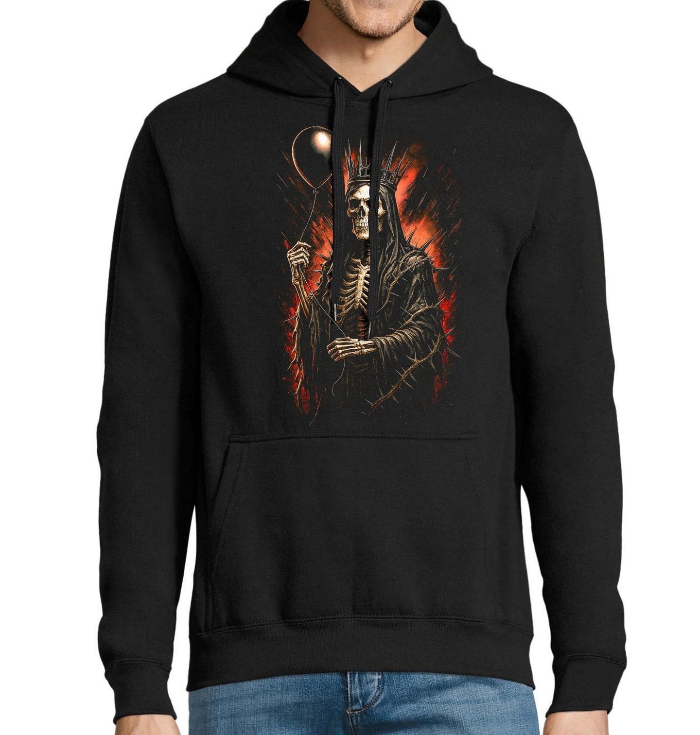 Pánská mikina Král Podsvětí. Drsný metalový motiv, kde kostlivec v koruně vládne temné scéně a drží černý balonek jako symbol zvrácené oslavy života a smrti. Ostré detaily, trny a temná energie dávají designu syrový rockový charakter, který připomíná koncertní atmosféru a rebelii bez hranic. Tento motiv spojuje metalovou estetiku, temnotu a ironii do jednoho silného vizuálu, ideální pro fanoušky rocku, metalu.