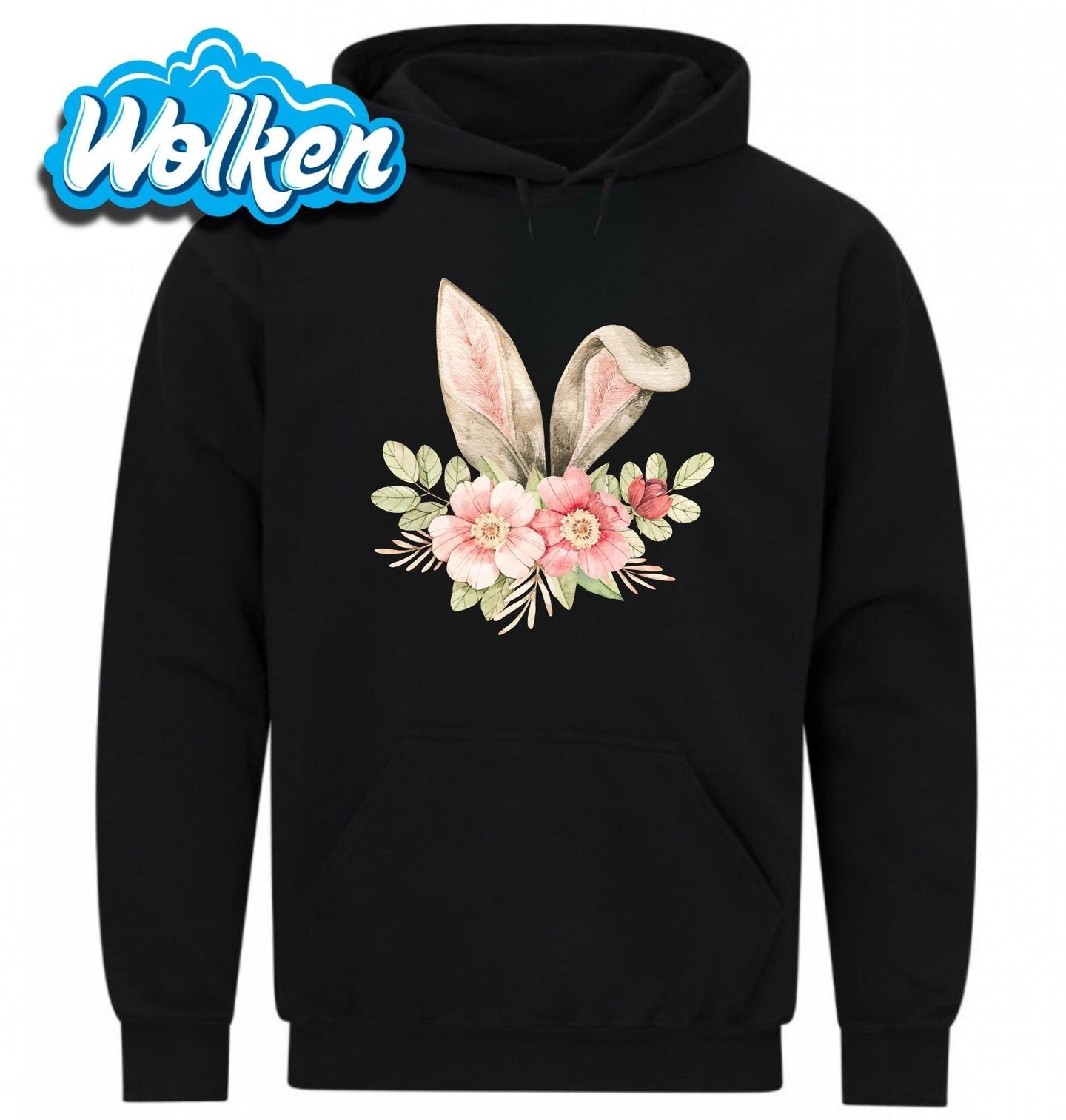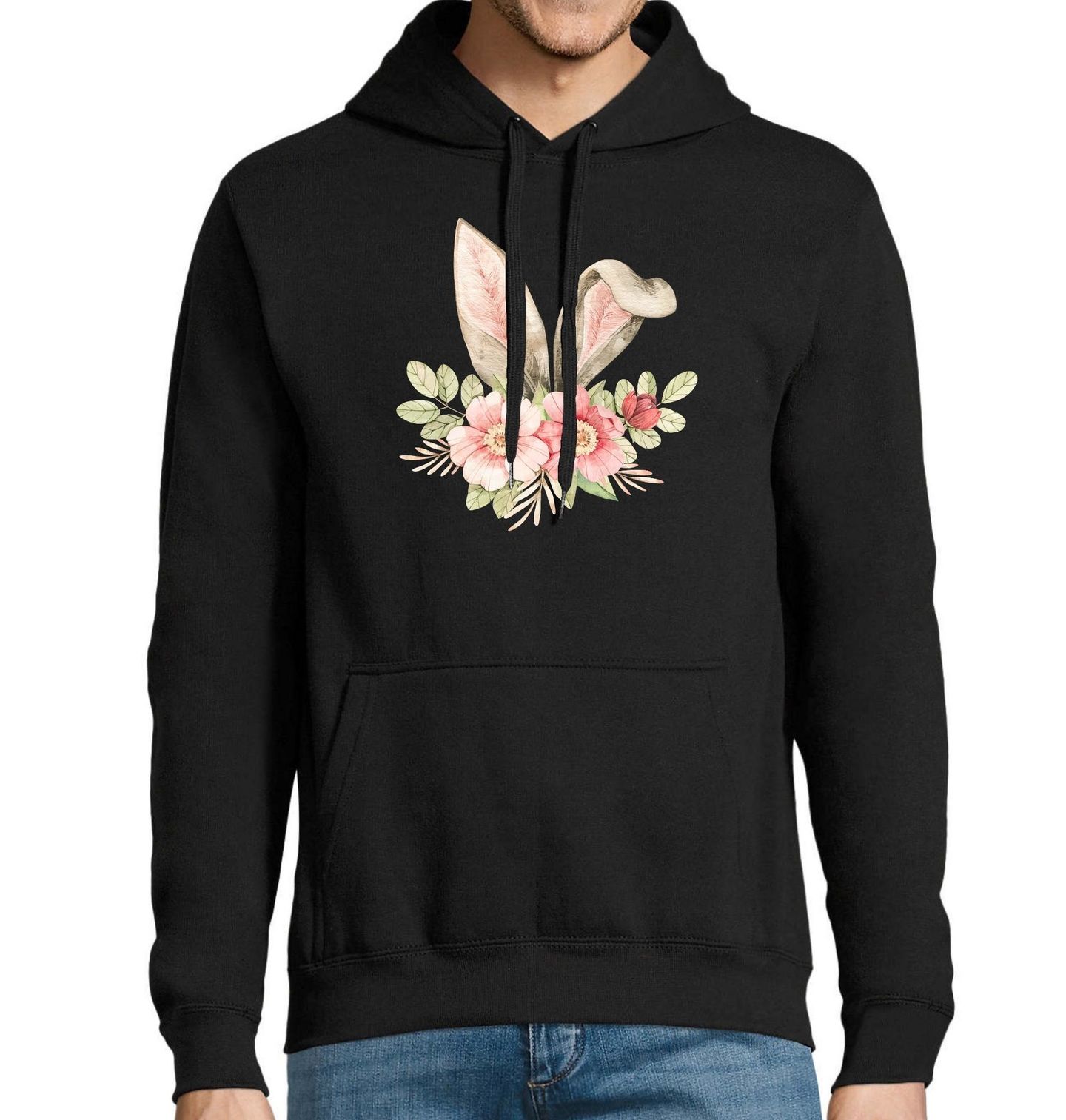 Pánská mikina Králičí Uši s květinami. Perfektní volba pro milovníky květinových motivů, jemné elegance a velikonočních oslav. Skvělý kousek pro jarní období, který rozjasní každý den! Stylové a něžné tričko s králičími oušky obklopenými květinovou kompozicí, které dokonale vystihuje jarní a velikonoční atmosféru.