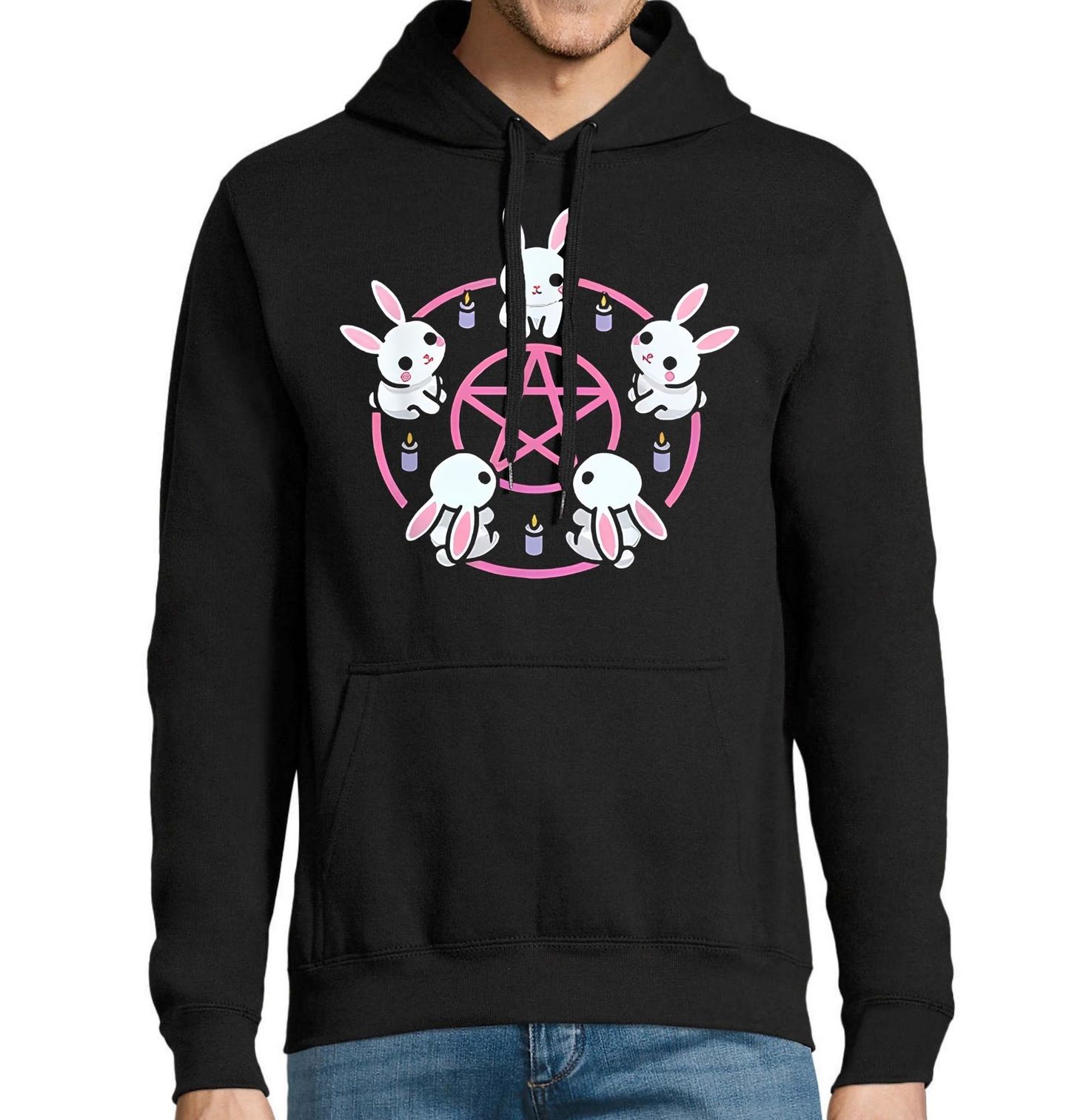 Pánská mikina Králíci v Rituálu. Neobvyklý motiv zobrazuje králíky sedící v kruhu kolem pentagramu a svíček, čímž vytváří kontrast mezi roztomilostí a temnou symbolikou. Tento design je ideální pro fanoušky alternativního stylu, mystiky a originálních ilustrací.