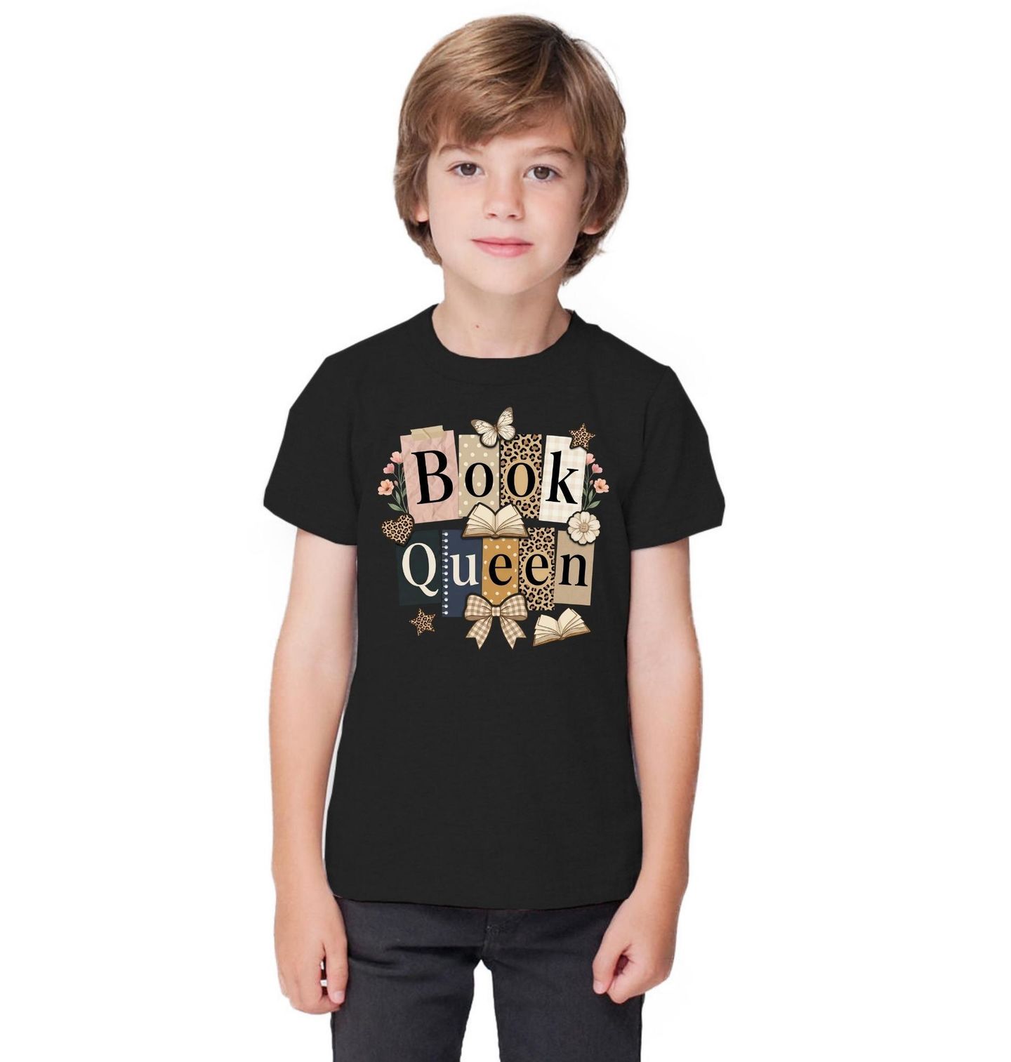 Dětské tričko Královna Knih Book Queen. Stylový a hravý motiv pro všechny milovníky knih a čtení. Dominantní nápis „Book Queen“ (v překladu „královna knih“) vyjadřuje hrdost na vášeň pro čtení a svět příběhů. Design doplňují jemné detaily jako květiny, motýl, mašle a ilustrace otevřených knih, které vytvářejí příjemnou a útulnou atmosféru. Tento motiv je ideální pro každého, kdo miluje čtení a chce svou lásku ke knihám ukázat stylově.