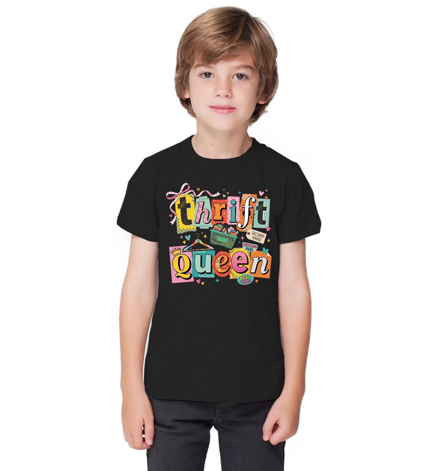 Dětské tričko Královna Second Handů Thrift Queen. Stylový a hravý motiv pro všechny ženy, které milují originální módu a radost z objevování jedinečných kousků. Tahle designová „královna“ ví, že nejlepší poklady se skrývají právě v second hand. Každé nakupování se tak mění v dobrodružství plné stylu, barev a radosti – a navíc za skvělou cenu.