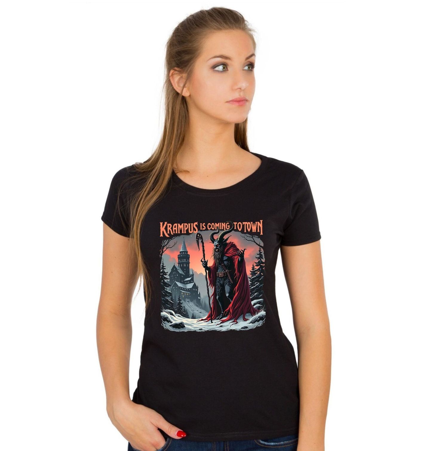 Dámské tričko Krampus přichází do města. Vánoce nemusí být jen o andělech a dárcích, ale i o tradičních strašidelných bytostech. Krampus, démonická postava z alpských legend, je vyobrazen v celé své síle – s rohy, holí a červeným pláštěm na zasněženém pozadí. „Krampus is coming to town“ je ideální pro všechny, kdo mají rádi netradiční pojetí Vánoc, legendy a trochu hororový humor.