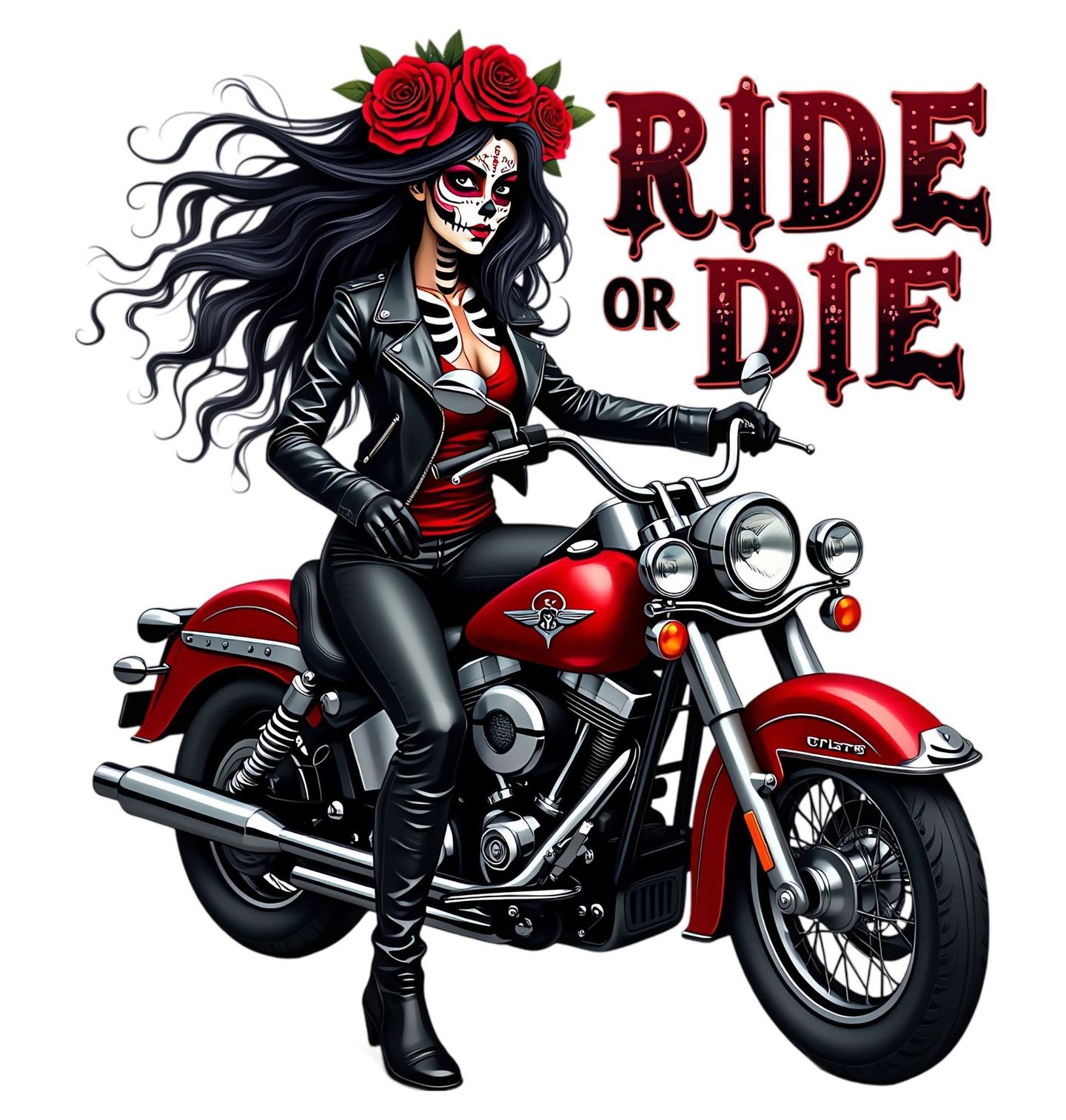 Pánské tričko Kráska na Motorce Ride or Die. Motorka ve stylu mexického svátku Día de los Muertos (Den mrtvých) je oslavou odvahy, vášně a života na plný plyn. Detailní ilustrace motorkářky s malovanou lebkou, rudými růžemi a ikonickým nápisem Ride or Die propojuje motivy smrti, lásky a svobody.