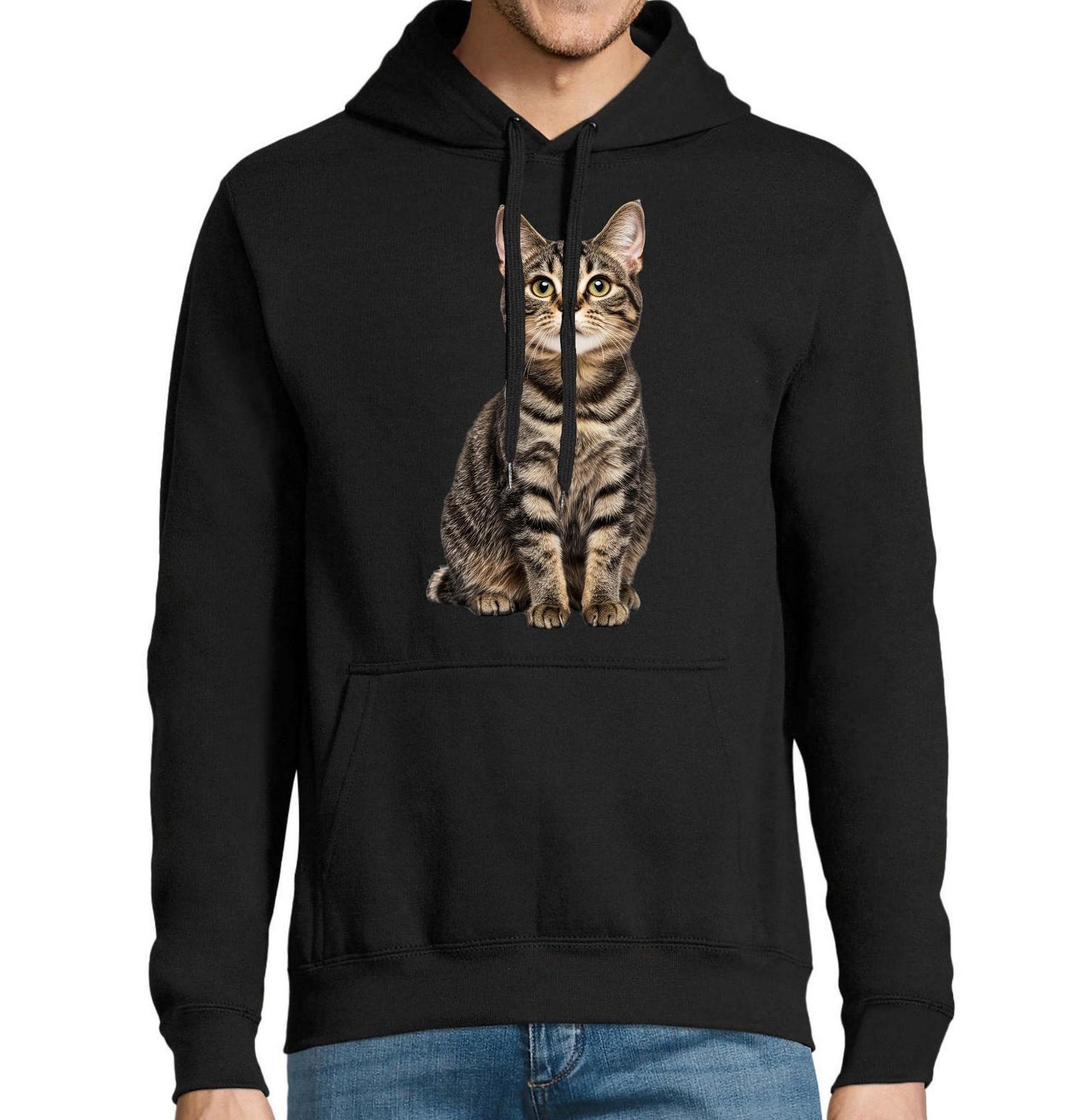 Pánská mikina Krátkosrstá Mourovatá Kočka. Tento realistický motiv zachycuje krásu a klid, který ztělesňuje kočka v celé své přirozenosti. Detailní portrét s výraznýma očima a typickým mourovatým zbarvením působí elegantně, čistě a nadčasově. Design vynikne na tmavém podkladu a okamžitě upoutá pozornost každého milovníka koček.