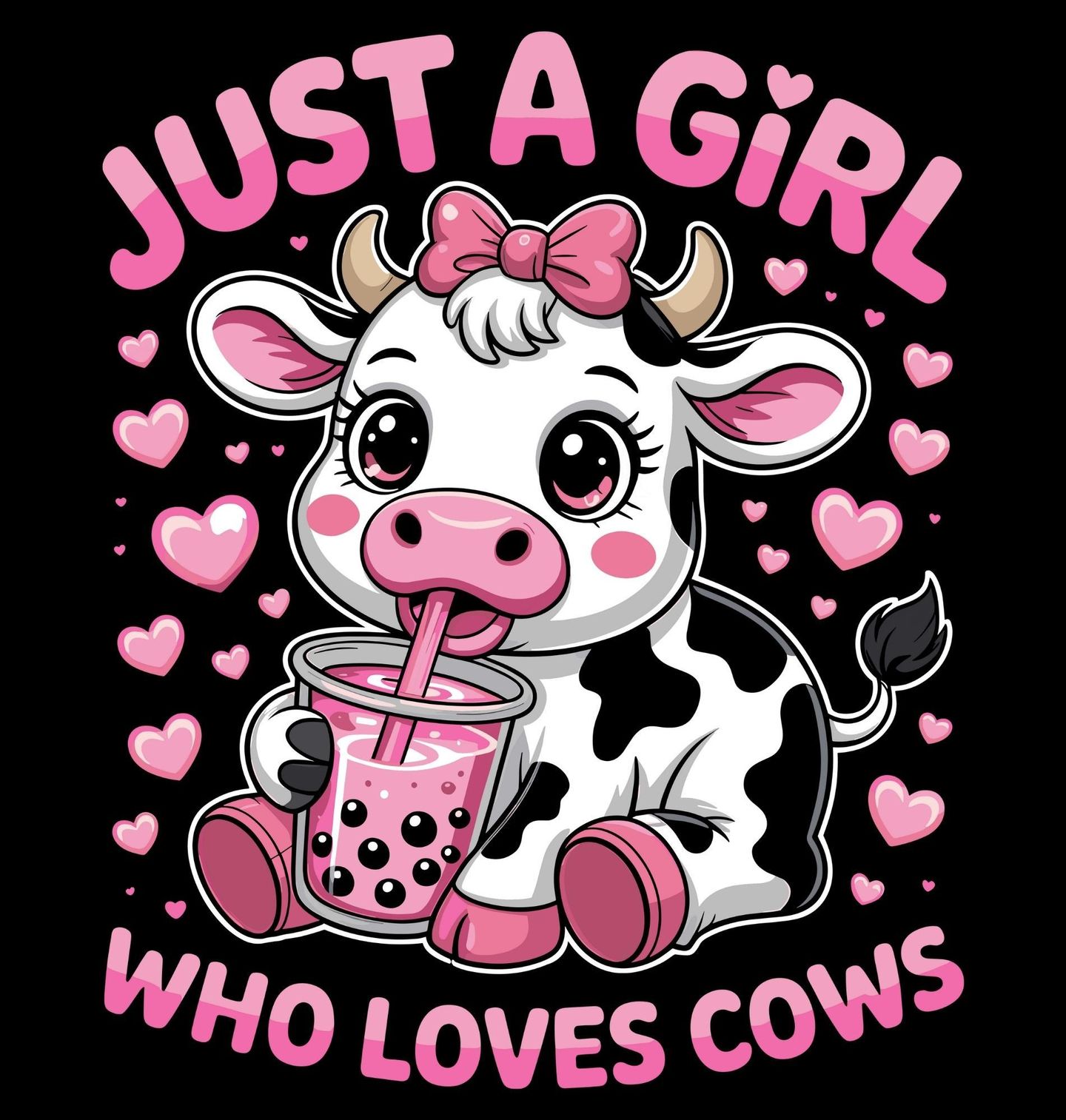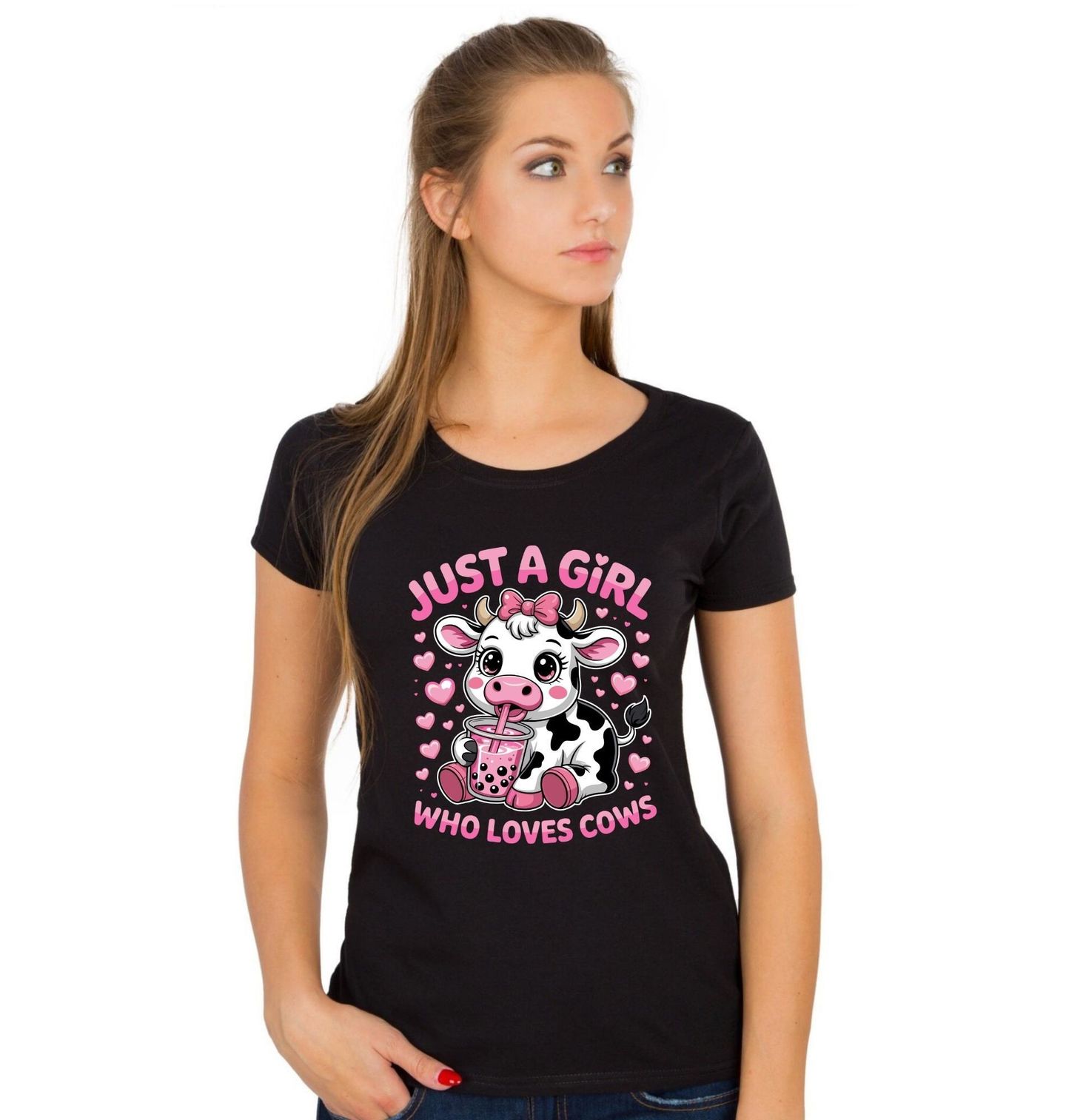 Dámské tričko Kráva s Bubble Tea Prostě holka, která miluje krávy. „Just a girl who loves cows“. Tato roztomilá kreslená kráva s růžovou mašlí a kelímkem bubble tea je jako stvořená pro každou milovnici roztomilostí, venkova a lahodných drinků. Hrací motiv spojuje svět sladkého nápoje, venkovského stylu a lásky ke zvířatům – přesně to, co potřebuje každá holka.