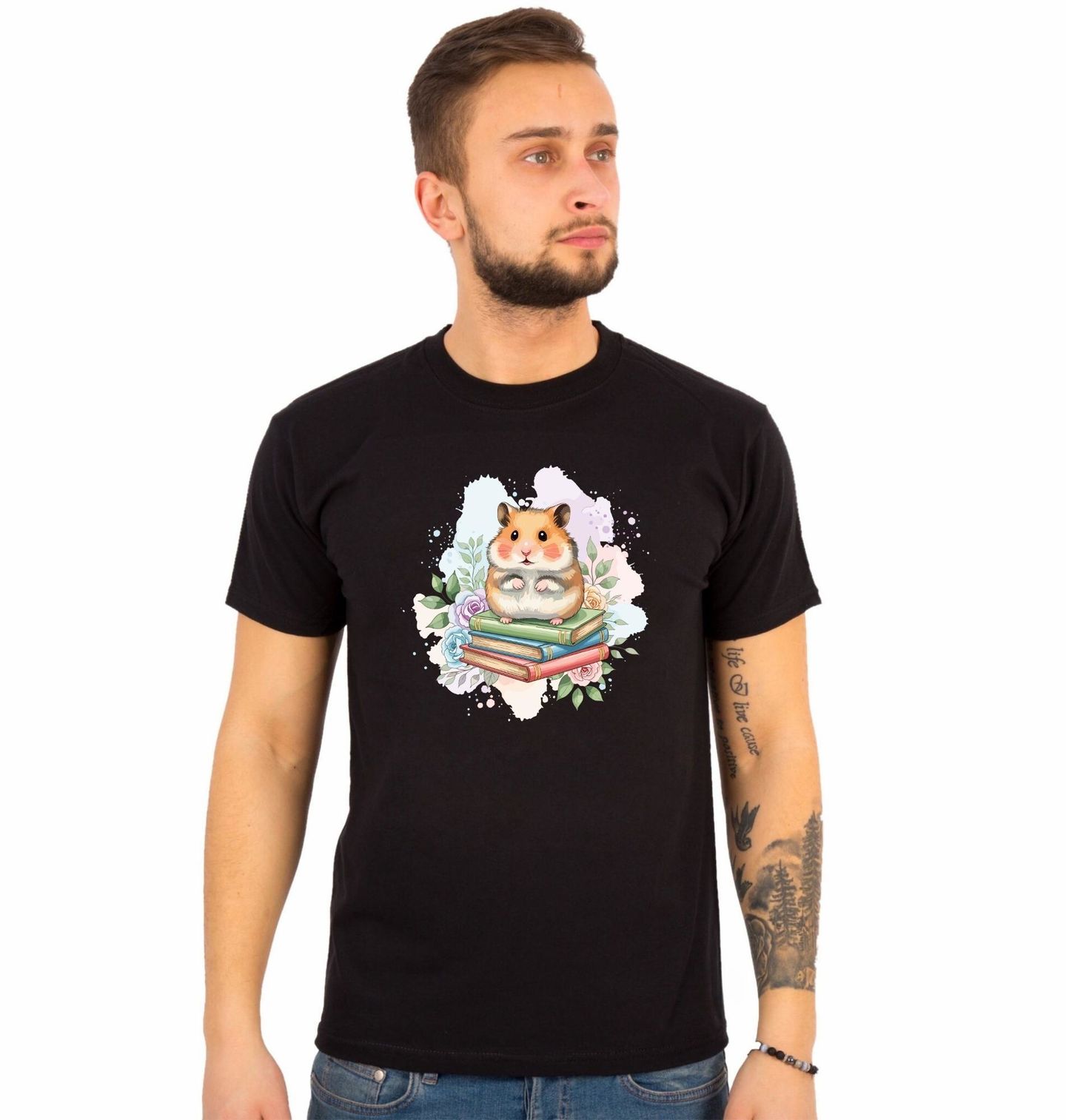 Pánské tričko Křeček na Knihách. Uprostřed ilustrace sedí roztomilý křeček na hromádce barevných svazků a kolem něj rozkvétají jemné květiny. Každá kniha je ilustrovaná v měkkých pastelových barvách a dohromady vytvářejí kouzelné knihy, které působí klidně, pozitivně a hravě. Ideální dárek pro čtenáře, studenty, děti i dospělé, kteří chtějí mít po ruce trochu radosti a pohody.