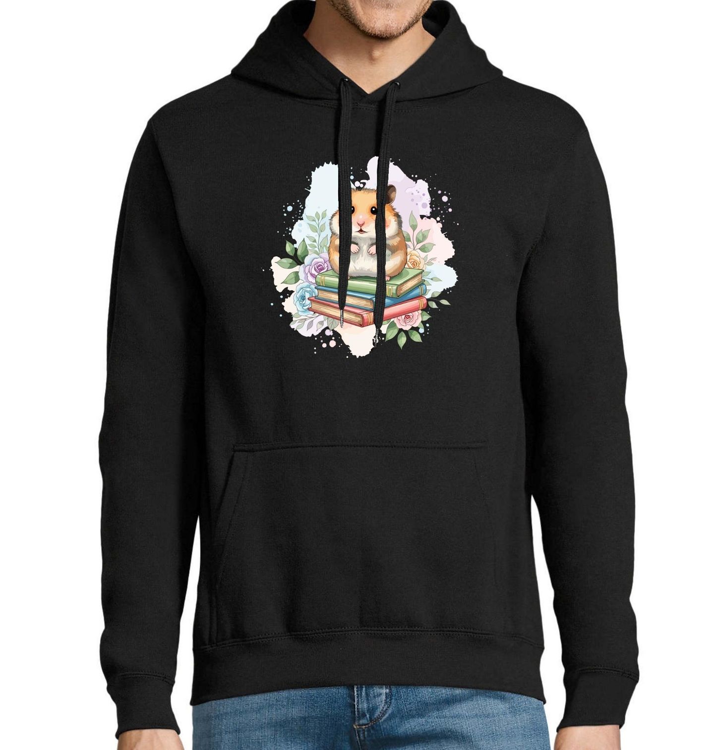 Pánská mikina Křeček na Knihách. Uprostřed ilustrace sedí roztomilý křeček na hromádce barevných svazků a kolem něj rozkvétají jemné květiny. Každá kniha je ilustrovaná v měkkých pastelových barvách a dohromady vytvářejí kouzelné knihy, které působí klidně, pozitivně a hravě. Ideální dárek pro čtenáře, studenty, děti i dospělé, kteří chtějí mít po ruce trochu radosti a pohody.