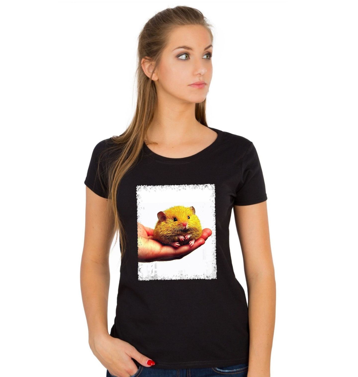 Dámské tričko Křeček v Dlani. Roztomilý motiv křečka bezpečně uloženého v lidské dlani. Tento jemný a láskyplný design zahřeje každé srdce. Ideální pro milovníky drobných mazlíčků a domácí pohody. Křeček vynikne i ve vyhledávání – motiv pro všechny, kdo chtějí mít roztomilost stále na očích!