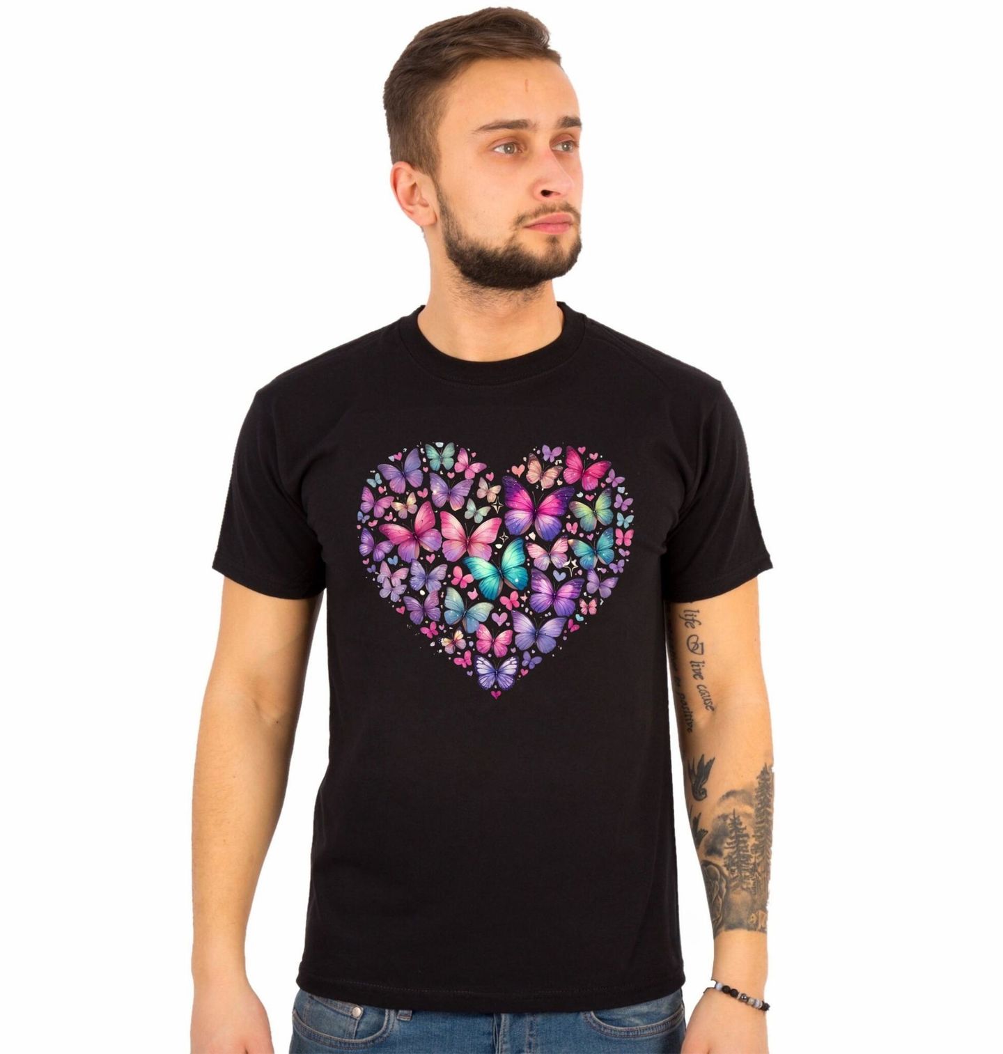 Pánské tričko Křehké Motýlí Srdce. Romantický a něžný motiv, kde se snoubí elegance a hravost. Barevné motýl tvary vytvářejí kouzelné srdce, které symbolizuje lásku, svobodu a proměnu. Tento design je ideální pro všechny, kdo milují jemnou estetiku, pastelové barvy a pozitivní energii. Detailní zpracování jednotlivých motýlů dodává motivu lehkost a dynamiku, zatímco celkový tvar srdce přináší hlubší význam a emoce.