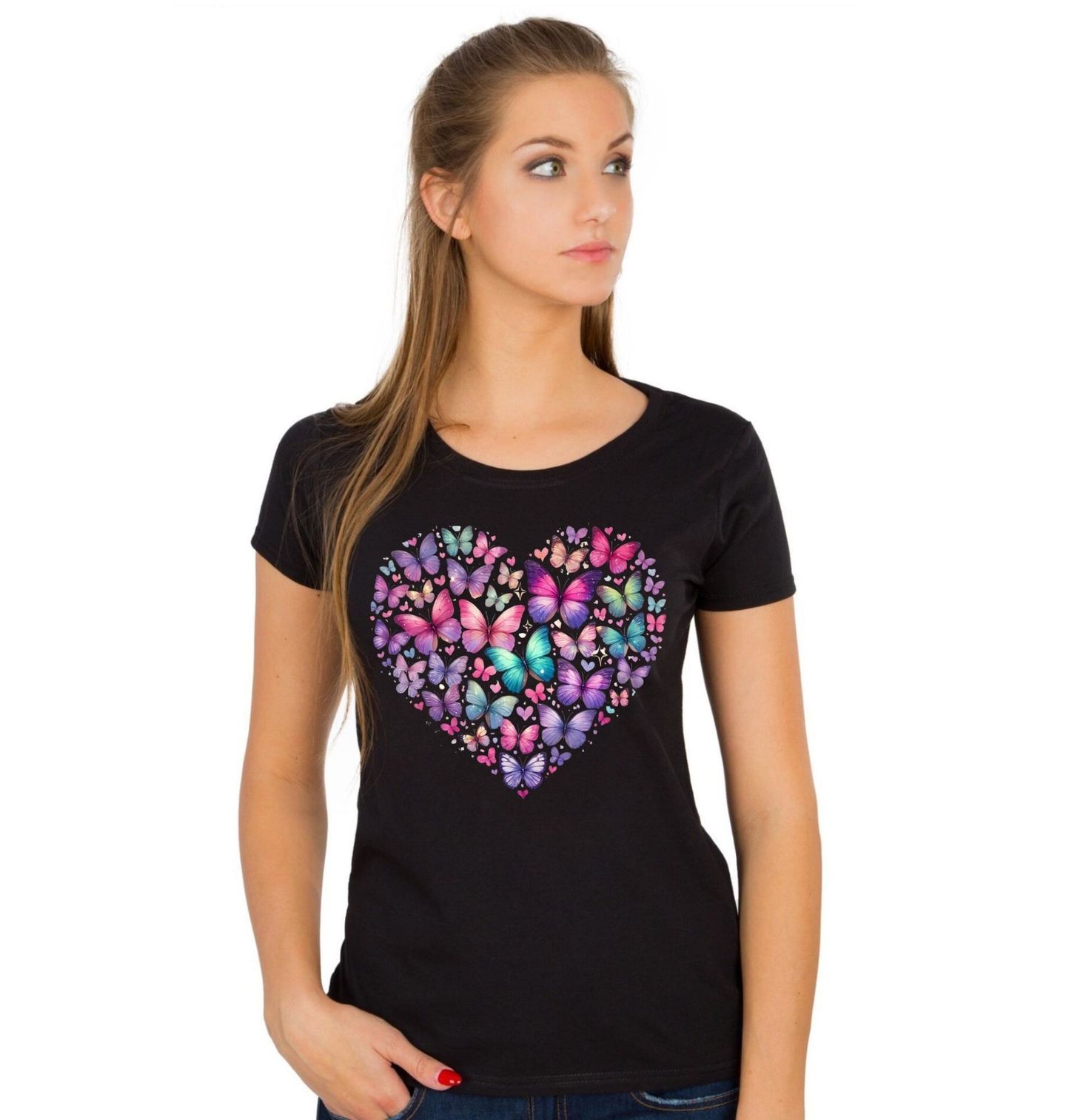 Dámské tričko Křehké Motýlí Srdce. Romantický a něžný motiv, kde se snoubí elegance a hravost. Barevné motýl tvary vytvářejí kouzelné srdce, které symbolizuje lásku, svobodu a proměnu. Tento design je ideální pro všechny, kdo milují jemnou estetiku, pastelové barvy a pozitivní energii. Detailní zpracování jednotlivých motýlů dodává motivu lehkost a dynamiku, zatímco celkový tvar srdce přináší hlubší význam a emoce.