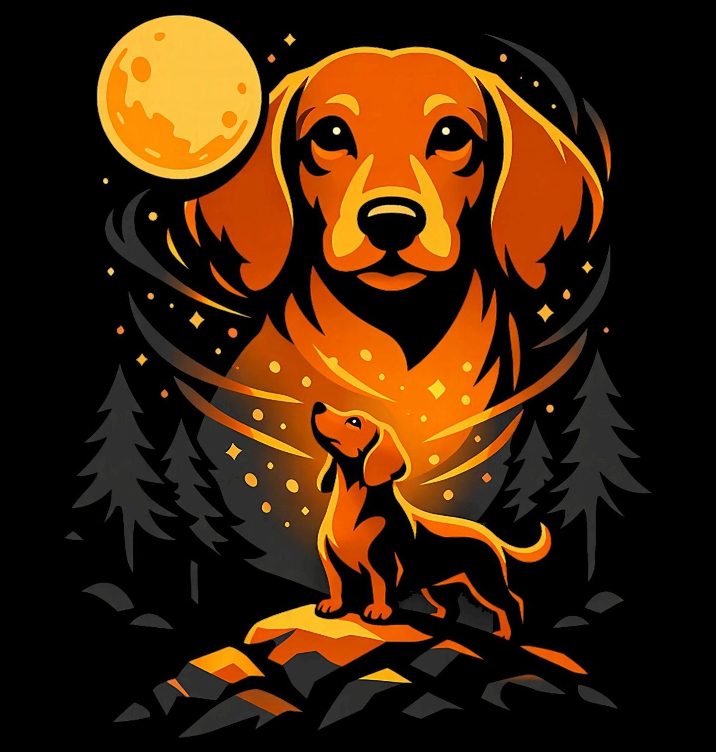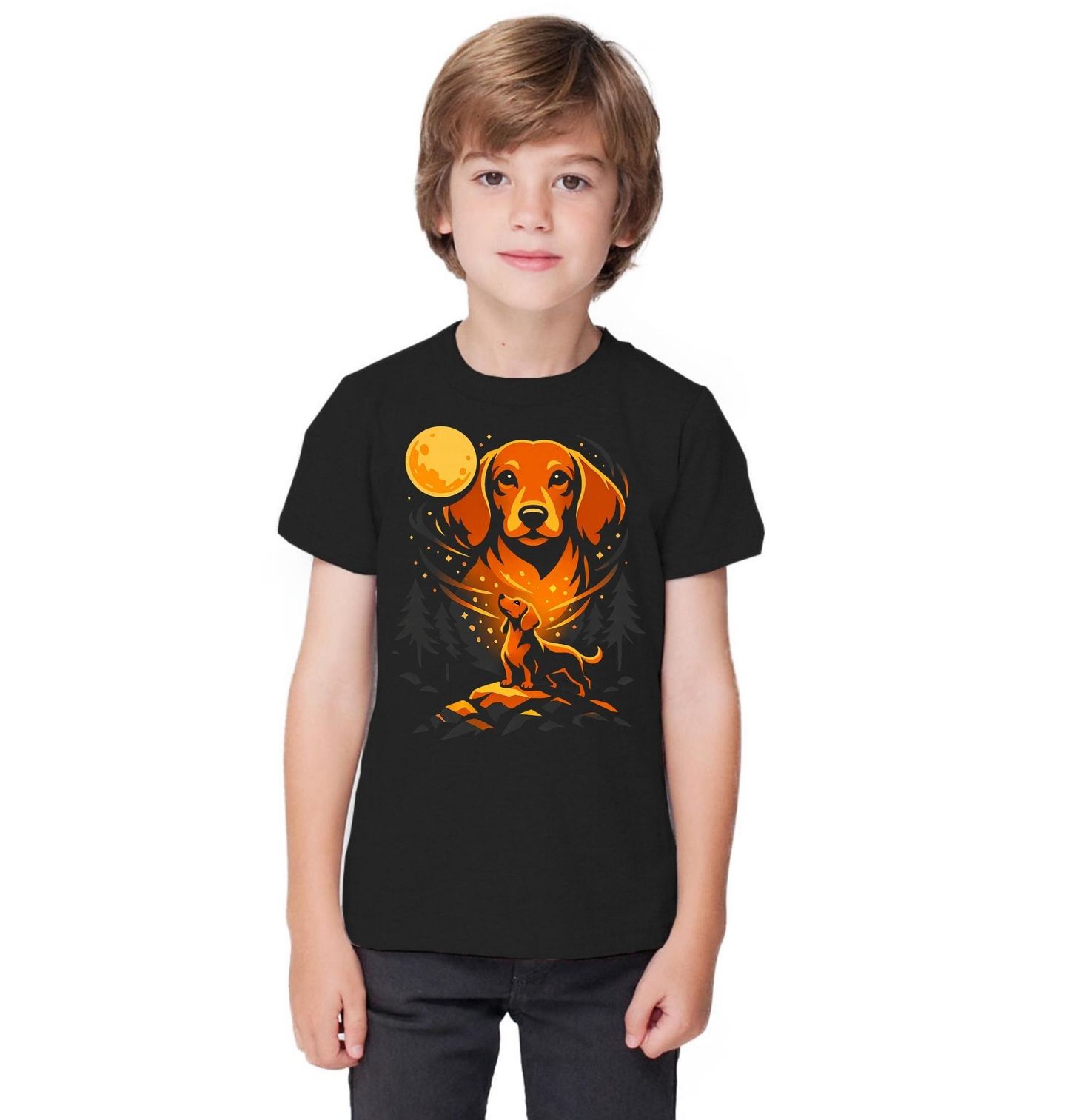 Dětské tričko Kreslený Jezevčík při Úplňku. Tento stylizovaný motiv zachycuje psa plemene jezevčík v magické noční krajině osvětlené září úplňku. Silueta lesa, hvězdy a tajemné světlo měsíce vytvářejí atmosféru dobrodružství a věrnosti, která dokonale vystihuje povahu tohoto odvážného malého psa.