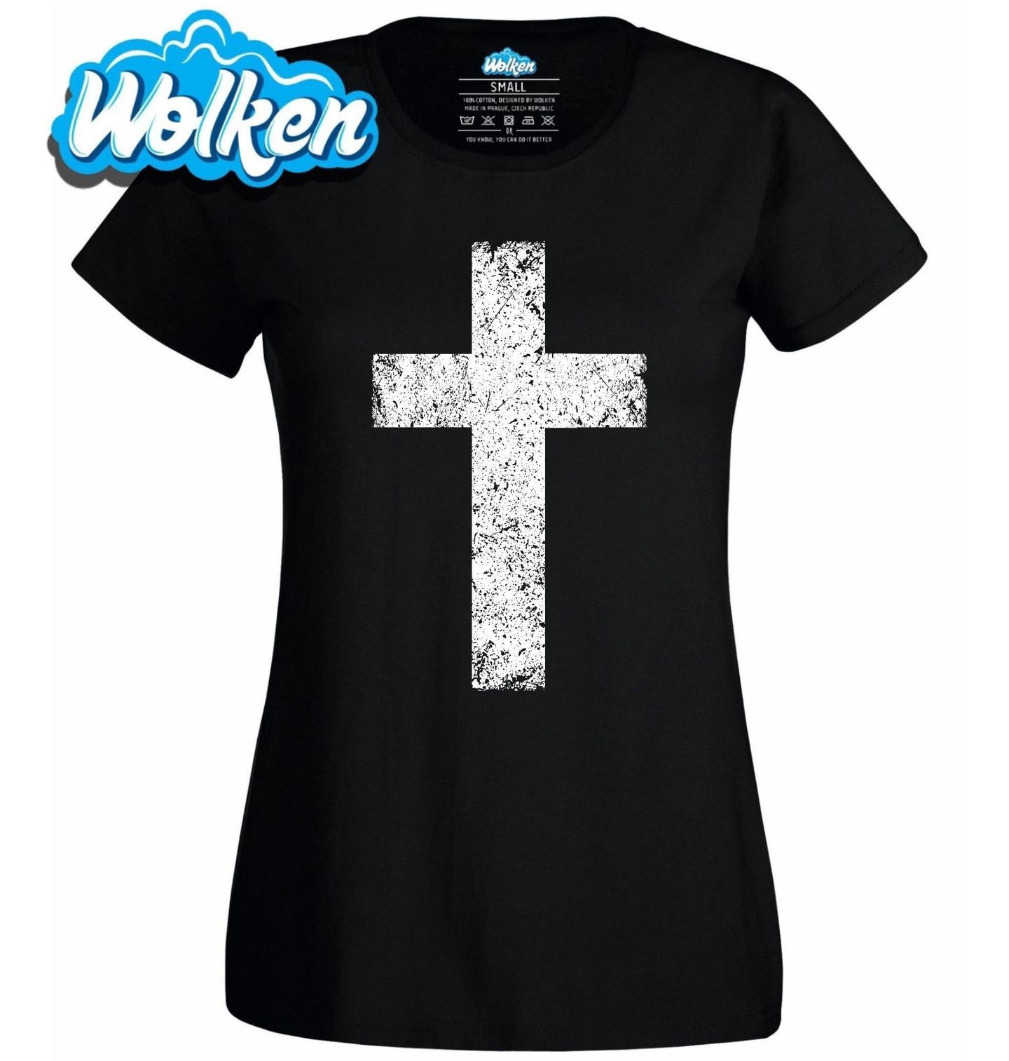 Dámské tričko Křesťanský Kříž. Kříž reprezentuje Ježíše, jeho smrt na Golgotě a následné zmrtvýchvstání, které tvoří základní kámen náboženství křesťanské víry. Černé pozadí a bílý, odřený kříž vytvářejí syrovou, ale hluboce duchovní estetiku – ideální pro věřící, kteří chtějí svou víru vyjádřit hrdě a stylově.
