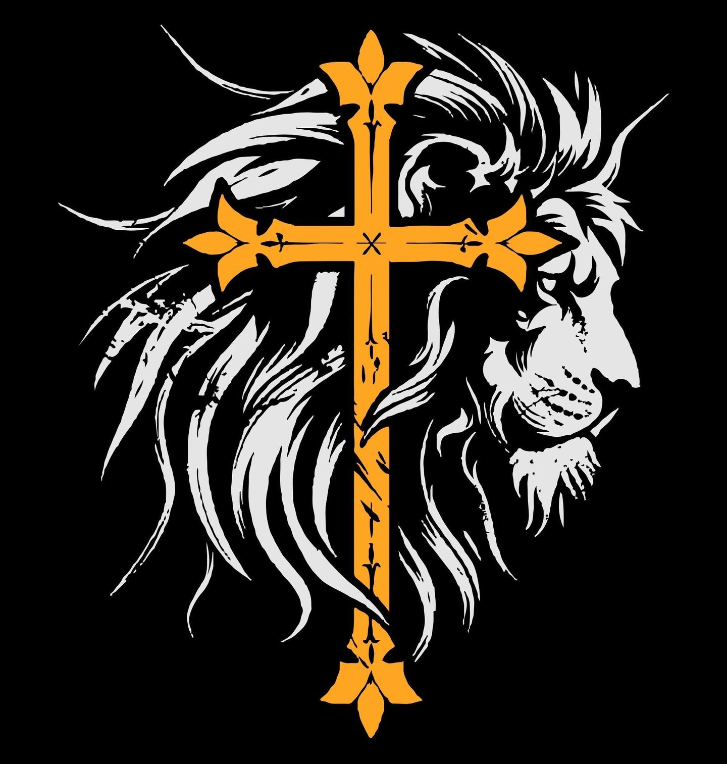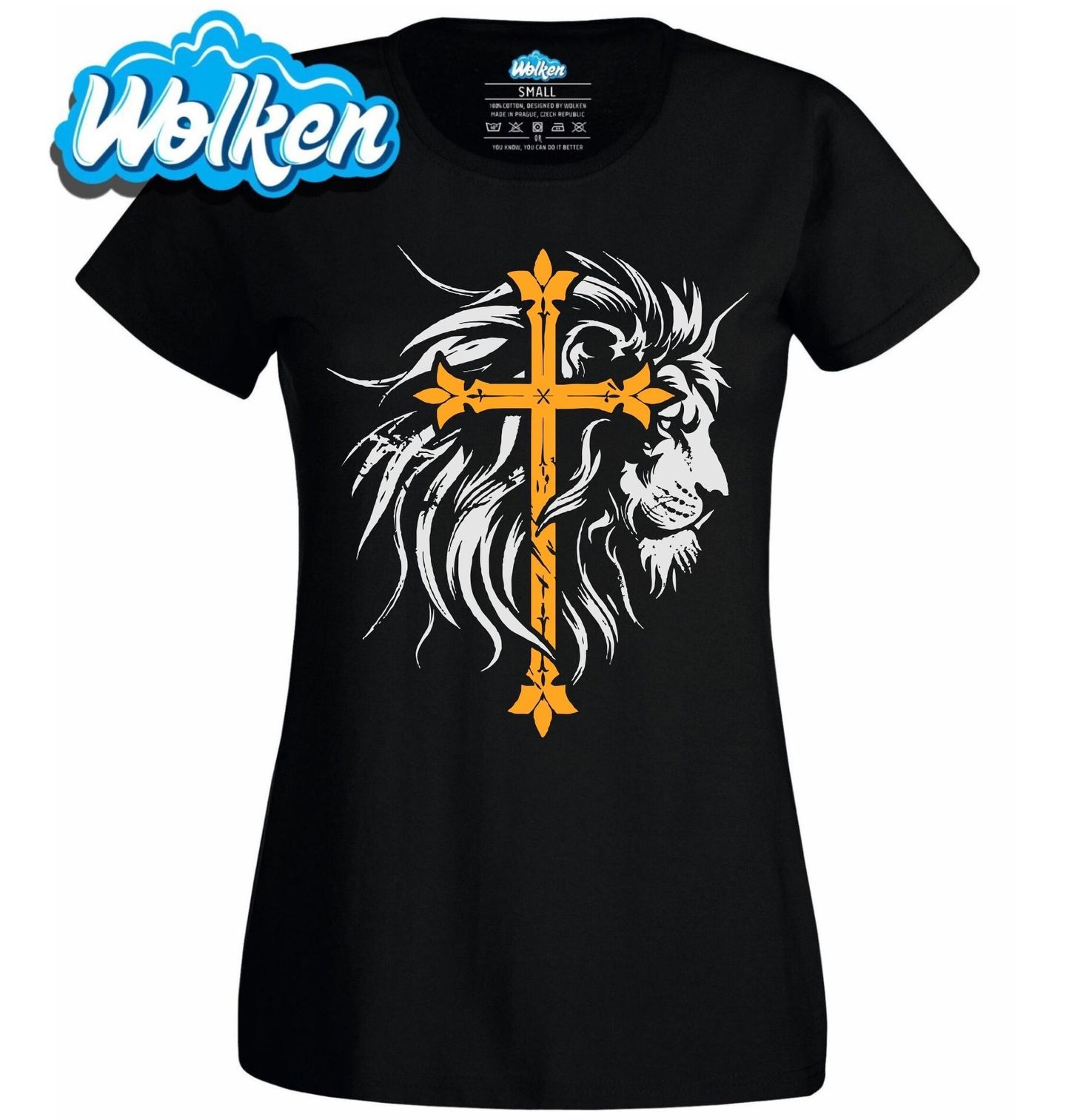 Dámské tričko Křesťanský Kříž a Lev z Judy. Tento působivý design spojuje majestátního lva s dominantním zlatým křížem – silný symbol křesťanství, odvahy a náboženství. Lev zde reprezentuje Ježíše Krista jako Lva z Judy, jak je popsán ve Zjevení 5:5, což odkazuje na jeho královský původ a moc.