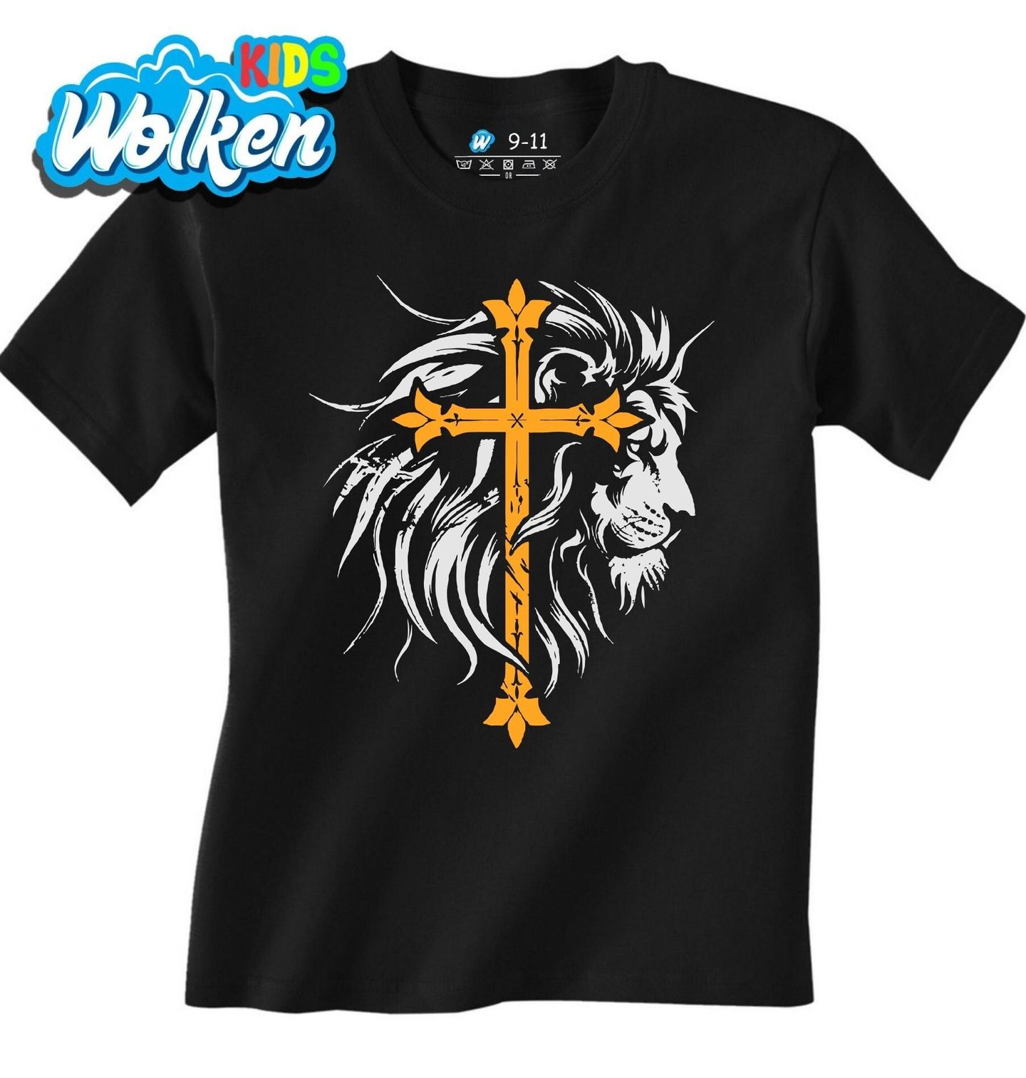 Dětské tričko Křesťanský Kříž a Lev z Judy. Tento působivý design spojuje majestátního lva s dominantním zlatým křížem – silný symbol křesťanství, odvahy a náboženství. Lev zde reprezentuje Ježíše Krista jako Lva z Judy, jak je popsán ve Zjevení 5:5, což odkazuje na jeho královský původ a moc.